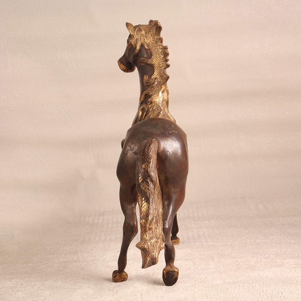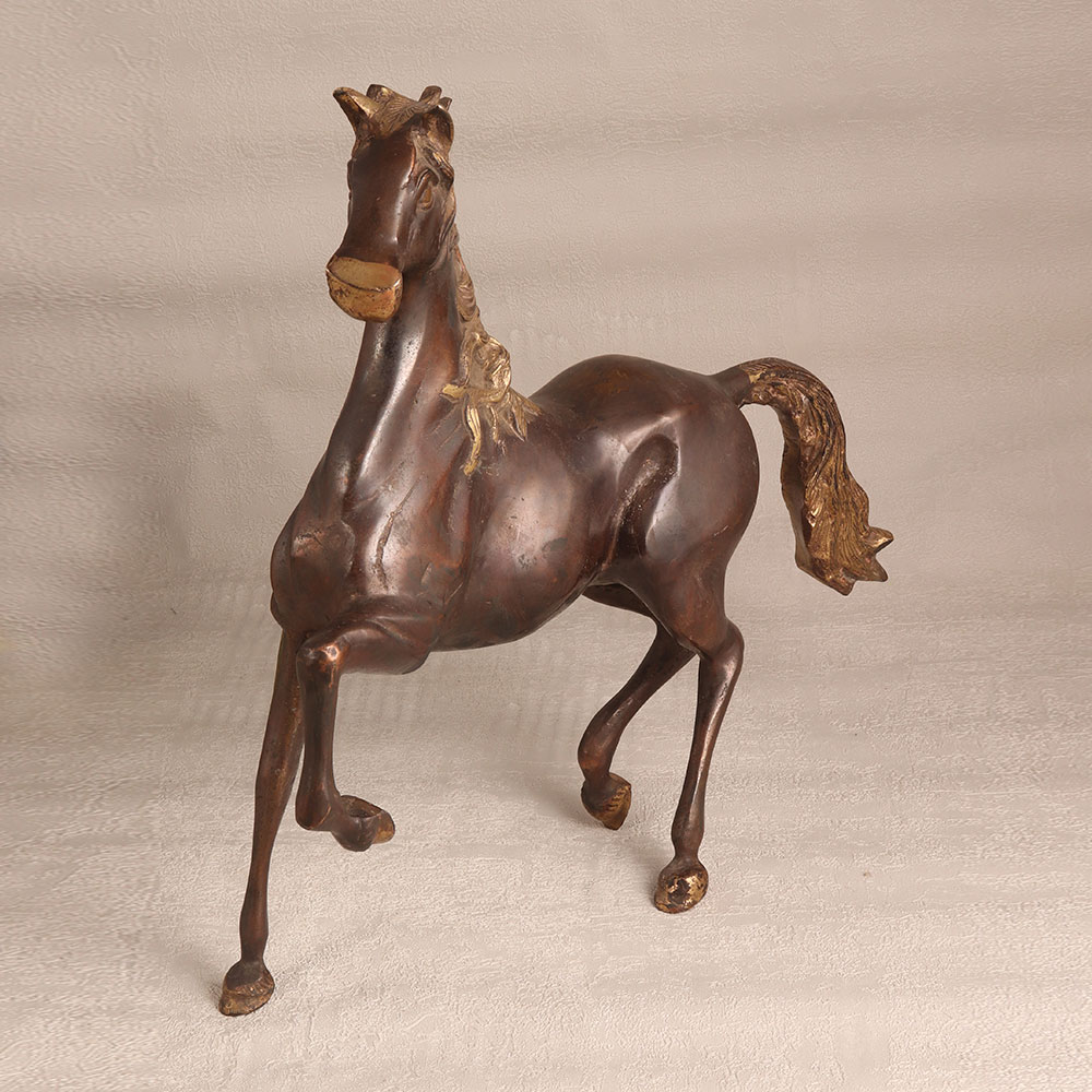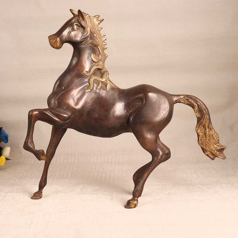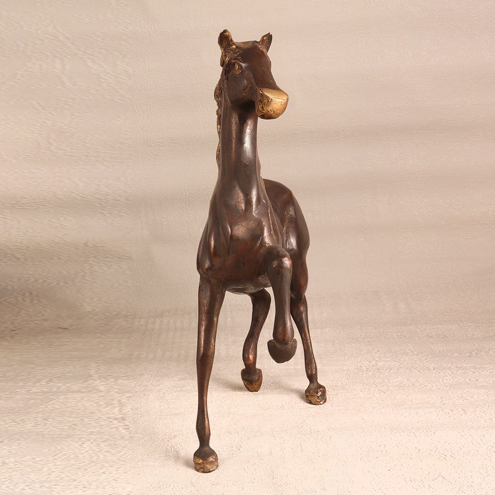 A brass statue of a regal horse that is meticulously crafted by skilled artisans in the European Art tradition. This piece boasts a lustrous antique brown finish that exudes a timeless charm, making it a stunning addition to any setting. Standing proudly on its pedestal, this handcrafted masterpiece showcases the unparalleled craftsmanship of its creators. The use of high-quality brass not only ensures its enduring beauty but also captures the fine details of the horse's form, from its majestic mane to the delicate curves of its muscles. Versatile and alluring, this brass horse statue can grace your home, office, hotel, cafe, shop, or restaurant, enhancing the ambiance with its classic allure. Whether you're a connoisseur of vintage collections or an aspiring curator, this masterpiece can be a focal point of your exhibition. Furthermore, it makes for an exceptional gift, perfect for expressing love and best wishes on special, festive, or auspicious occasions. Delight your loved ones with a symbol of elegance and craftsmanship that will endure for generations to come.