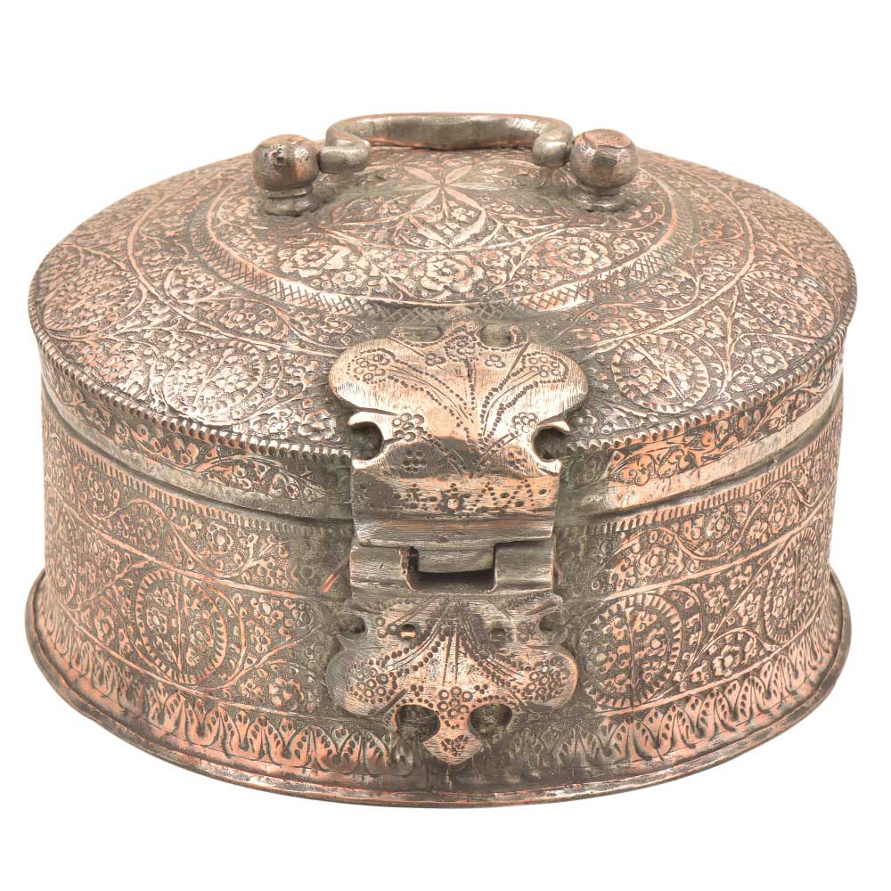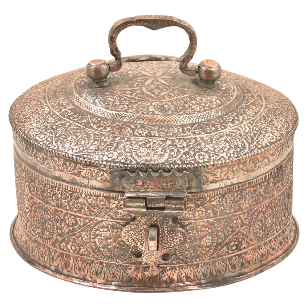 Handcrafted Embossed Or Carved Copper Indian Pandaan With Lock Handle