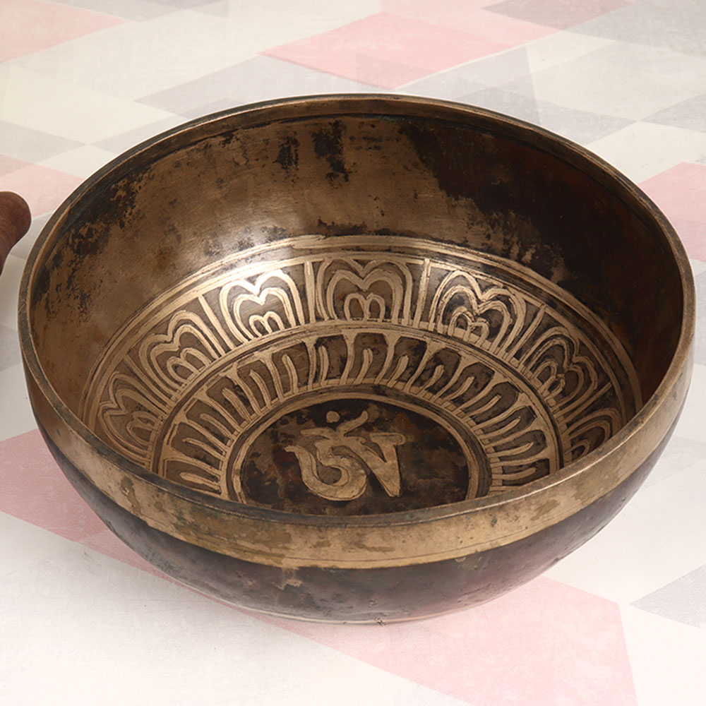 This Vintage Bell Metal Om Singing Bowl is a masterpiece crafted by skilled Tibetan artisans. Made from high-quality bell metal, this exquisite singing bowl exudes an aura of authenticity and artistry. It is presented in an enchanting antique brown finish, reminiscent of a bygone era. This exceptional piece is versatile, perfect for enhancing the ambiance in your home, office, restaurant, hotel, or shop. As a decorative item, it carries a sense of tradition and spiritual significance, making it a captivating addition to any space. Beyond its ornamental value, this singing bowl also serves a meditative purpose. The rich, resonant sound produced by striking the bowl with the included wooden mallet brings tranquillity and balance to your environment. It can be used for mindfulness and relaxation, making it a valuable addition to your meditation or yoga practice. For collectors of vintage treasures, this singing bowl is a unique find, and it holds a special place in vintage collector’s hearts. Moreover, it makes for an extraordinary gift, perfect for expressing your love and blessings on special, festive, or auspicious occasions. Share the serenity and cultural heritage encapsulated in this vintage bell metal Om Singing Bowl with your loved ones today.
