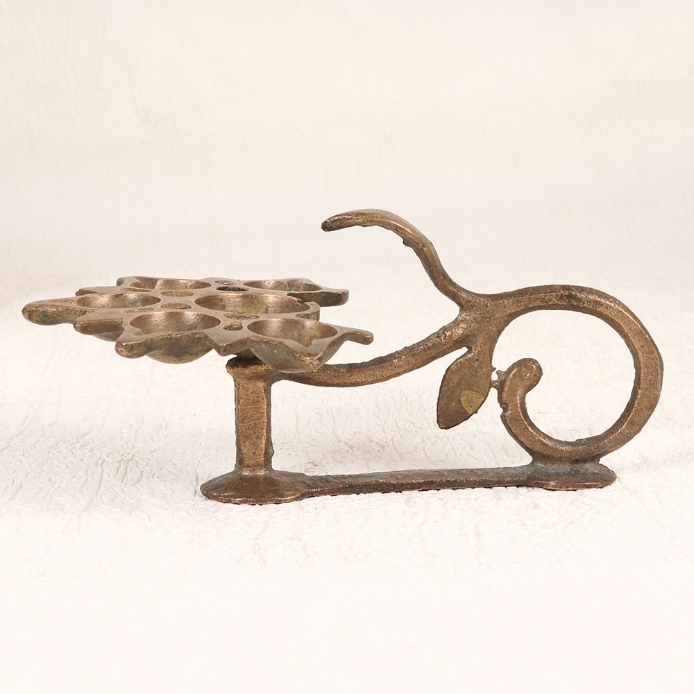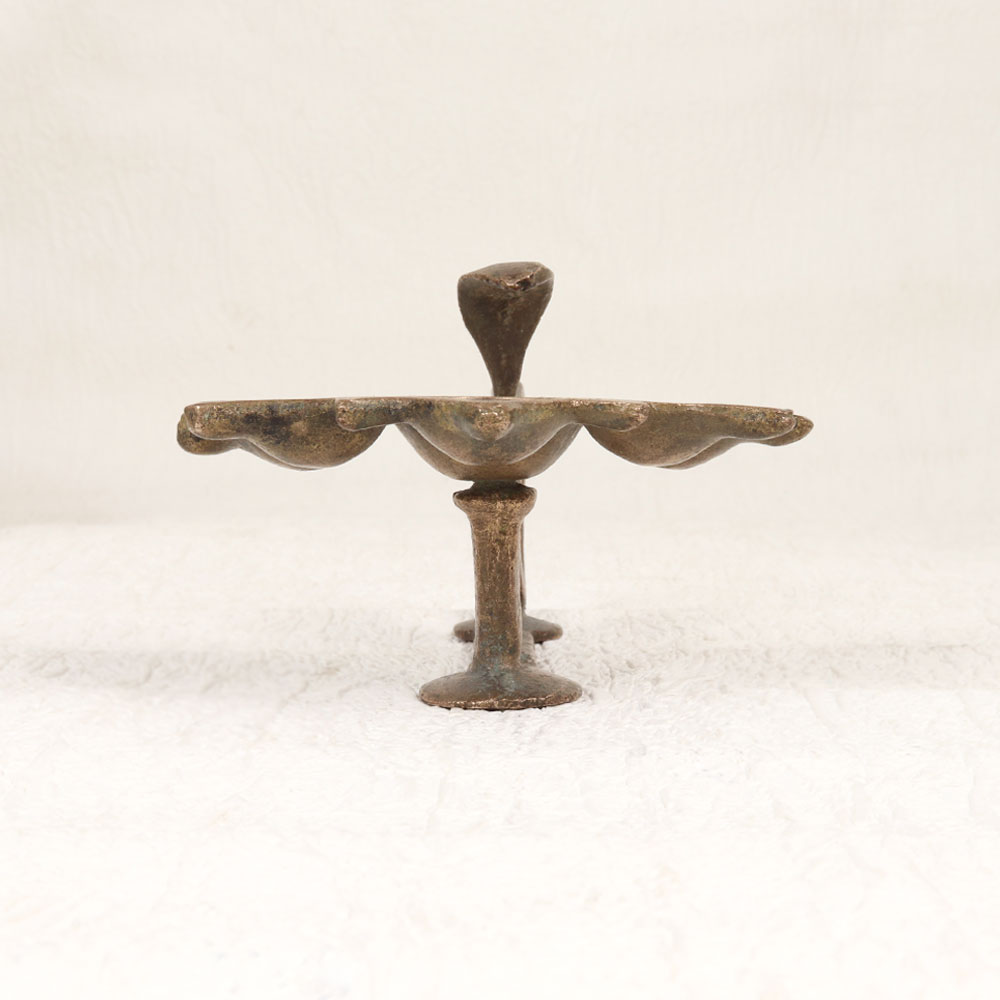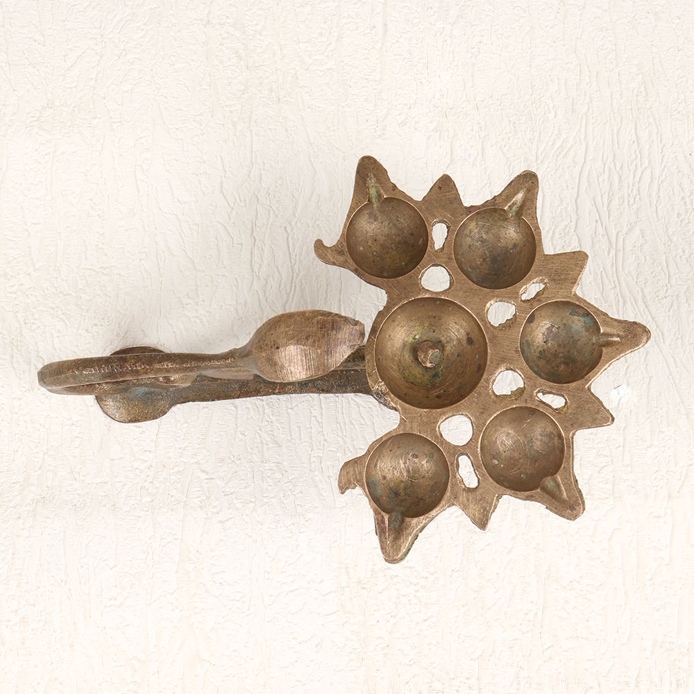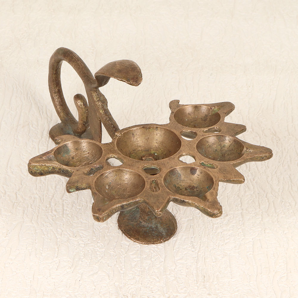Enhance your sacred spaces with the timeless charm of our Vintage Brass Aarti Oil Lamp. Handcrafted by professional Indian artisans, this exquisite piece showcases the artistry and craftsmanship of a bygone era. The lamp is forged from high-quality brass, ensuring durability and a radiant luster that only improves with age. Adorned with a distinctive cobra handle, the lamp features six jyots, each ready to be illuminated using traditional fuels such as mustard oil or ghee. The antique brown finish adds a touch of antiquity, making it a perfect addition to any home, office, restaurant, hotel, or café prayer room. Its versatile design seamlessly blends with both contemporary and traditional decor, making it an ideal piece for those with a penchant for vintage aesthetics. Beyond its aesthetic appeal, this Aarti Oil Lamp holds cultural significance and serves as a cherished item in any vintage collection. Share the warmth of tradition by gifting it to your family, friends or relatives on special, festive, or auspicious occasions. Embrace the divine glow and spiritual ambiance created by this meticulously crafted masterpiece, bringing a touch of India's rich heritage to your personal or shared spaces.
