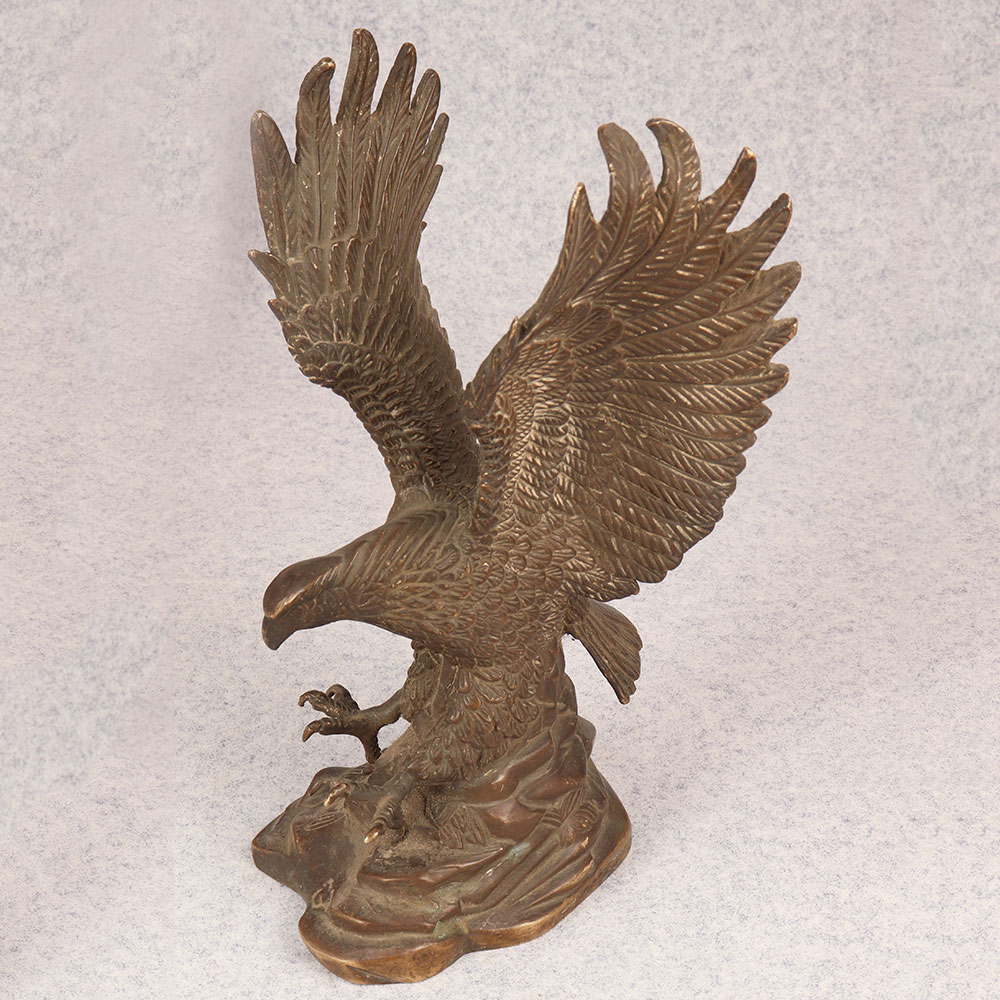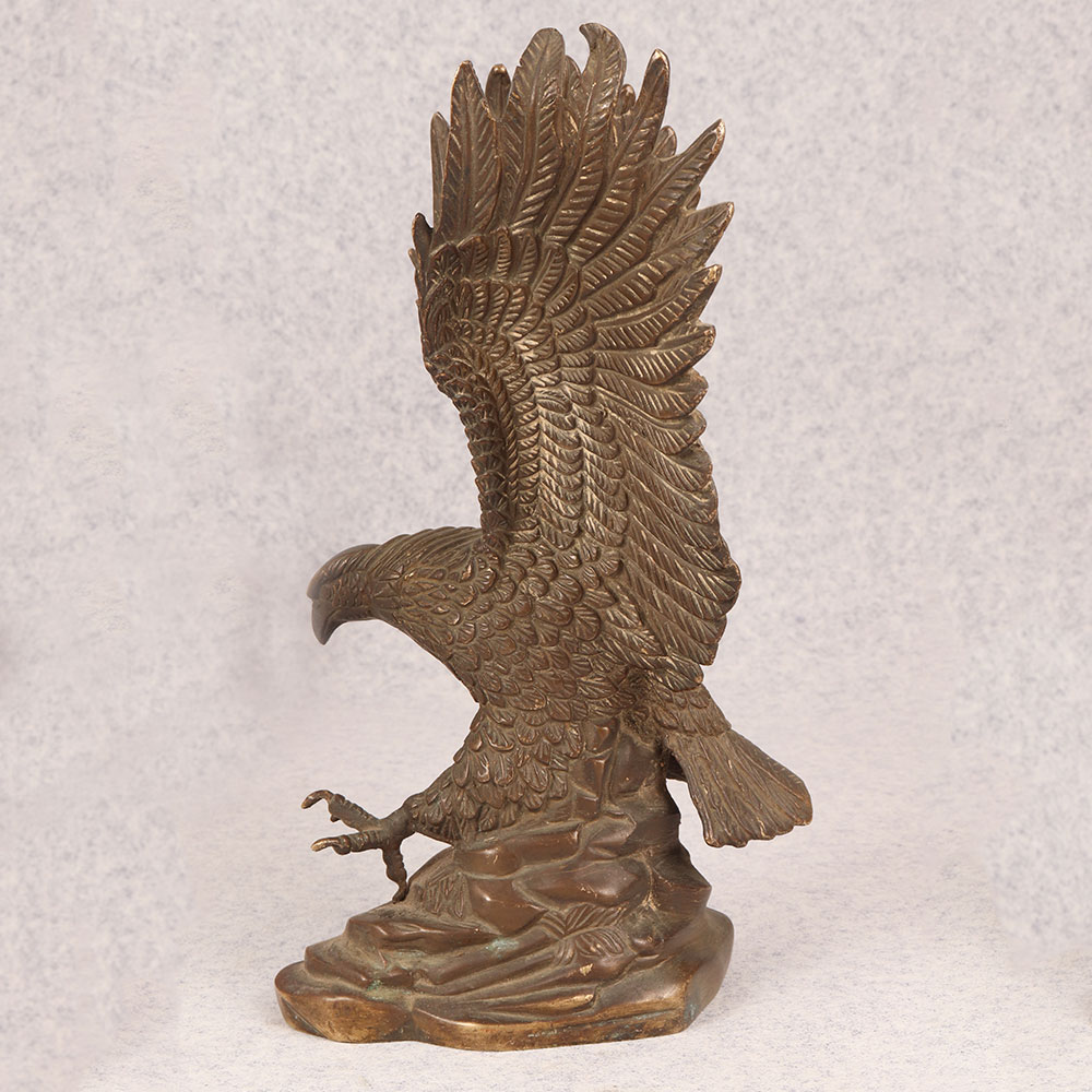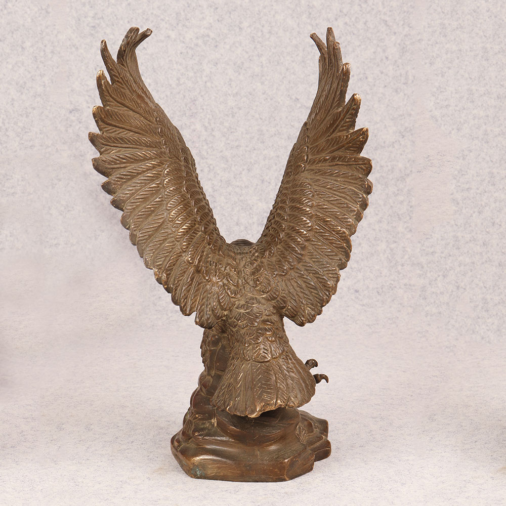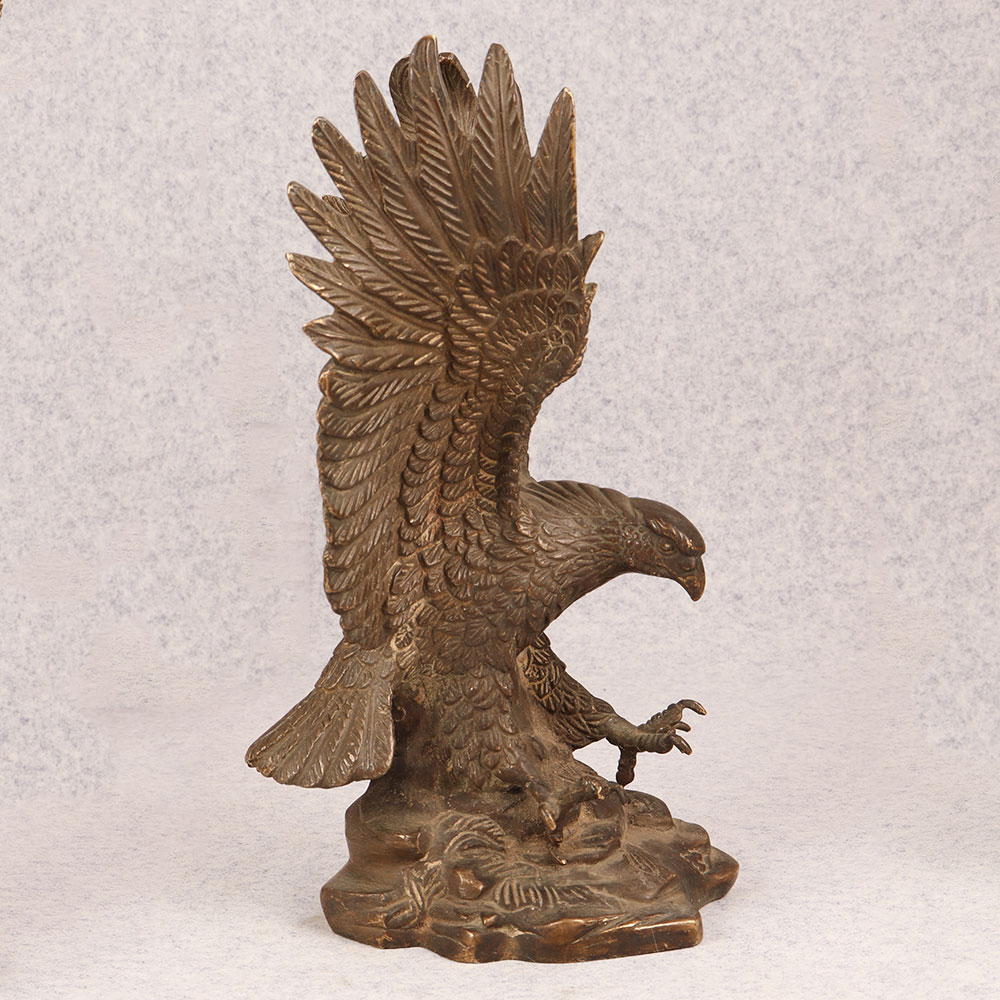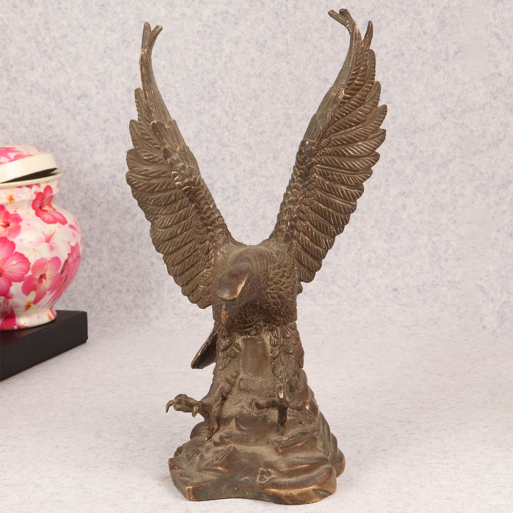 Behold the majestic embodiment of strength and grace in the form of our brass eagle statue, poised in a fearless attacking stance upon a platform. Meticulously crafted by talented Indian artisans, this exquisite masterpiece showcases the unparalleled artistry that comes from generations of expertise. The statue's antique brown finish adds a touch of timeless elegance, highlighting the intricate details that bring the noble creature to life. Handmade from high-quality brass, this awe-inspiring eagle statue is a symbol of power and freedom, making it a perfect addition to any space. Whether adorning your home, office, restaurant, hotel, or cafe, its commanding presence captivates attention and elevates the ambiance. Embrace the spirit of vintage charm by incorporating this striking piece into your collection, and watch as it becomes a focal point of admiration. Versatile and meaningful, this brass eagle statue serves as an exceptional gift for your family, friends or relatives on special, festive, or auspicious occasions. Its symbolic representation of strength and courage makes it a thoughtful gesture that resonates with both personal and professional connections. Celebrate the beauty of craftsmanship and the spirit of the eagle with this remarkable handmade creation.