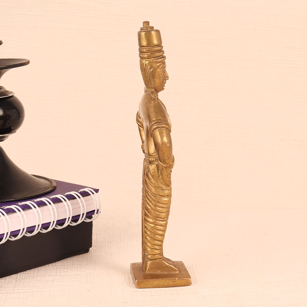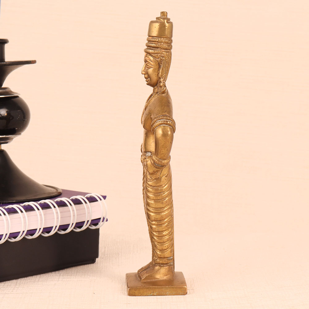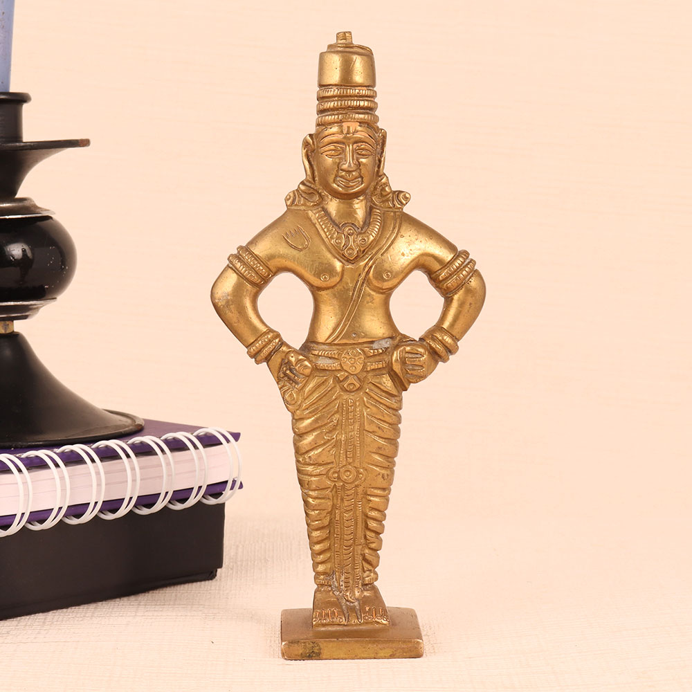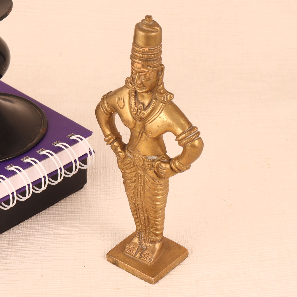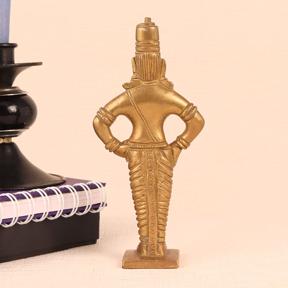 This Brass Statue of Lord Vitthal is a magnificent work of art that seamlessly blends spirituality, craftsmanship, and elegance. Standing majestically on a meticulously crafted platform, this exquisite piece boasts an antique golden finish that exudes timeless charm. Lord Vitthal, a revered deity in Hinduism is a manifestation of Lord Krishna and is often depicted in a distinctive manner, adorned with ornaments and a distinctive headdress. This handmade masterpiece is a testament to the devotion and skill of Indian artisans who have poured their expertise into creating a lifelike representation of Lord Vitthal. Crafted from high-quality brass, it radiates a lustrous glow, accentuating the divinity it symbolizes. This divine masterpiece is versatile in its use. It can grace the sanctity of your home's prayer room, add a touch of spirituality to your office, enhance the ambiance of your restaurant, hotel, cafe, or shop, or become a prized addition to any collector's vintage collection. Moreover, it makes for an exceptional and heartfelt gift for your family, friends or relatives on special, festive, or auspicious occasions, carrying with it the blessings of Lord Vitthal himself. Embrace spirituality and artistic excellence with this Brass Statue of Lord Vitthal that is a true masterpiece of devotion and craftsmanship.