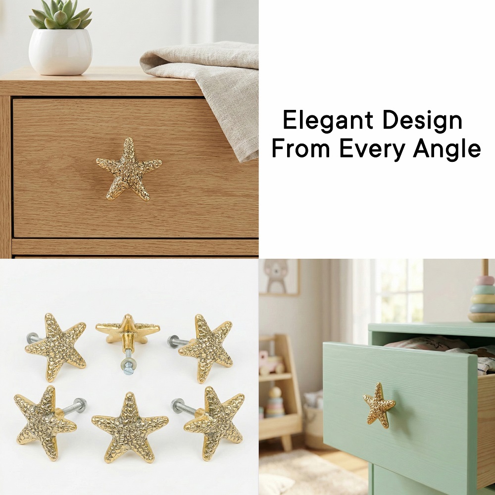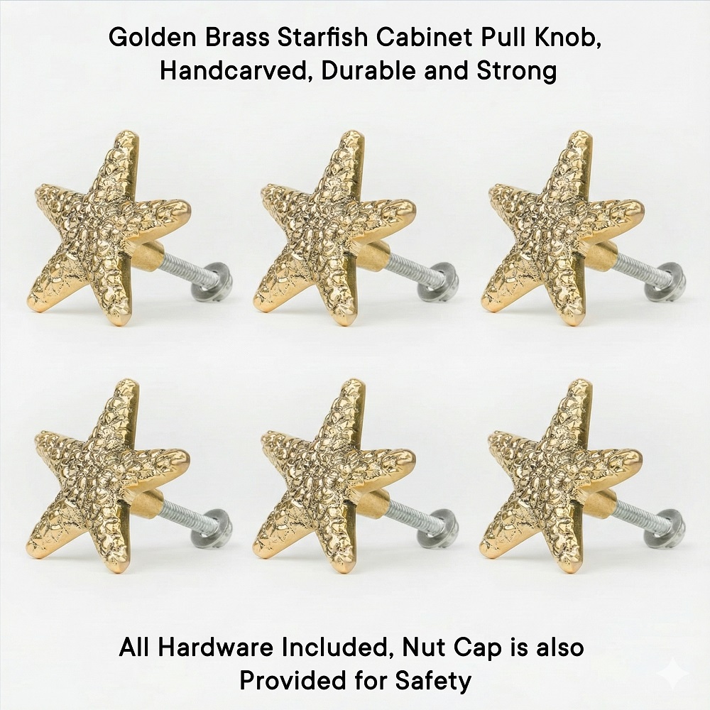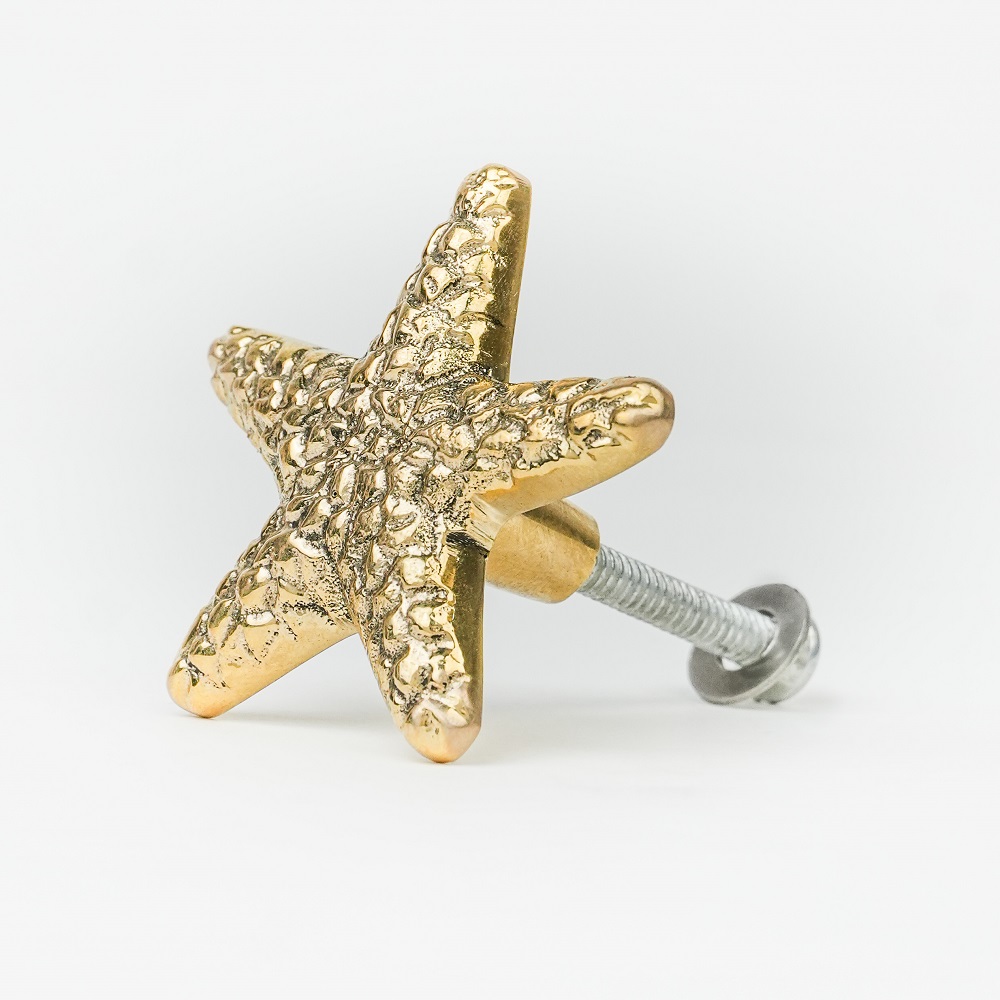A decorative, Brass drawer pull or knob in the shape of a Starfish. The item has a ridged, fan-like texture and a metallic finish, possibly brass or gold-toned. It is suitable for adding a coastal or vintage accent to furniture like dressers, cabinets, or drawers.