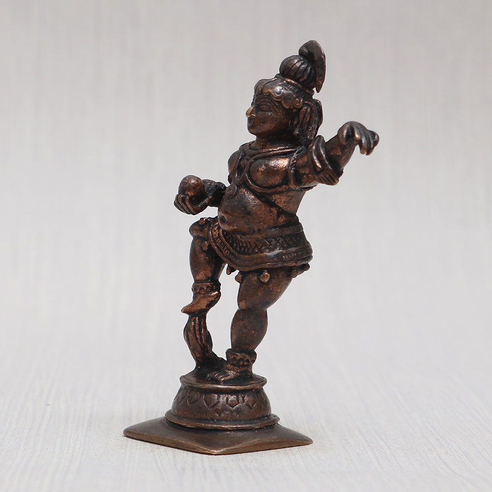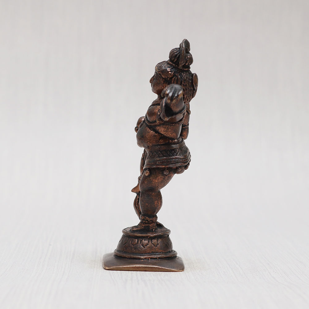 Buy a Copper Baby Lord Krishna standing statue online that is handcrafted by talented Indian craftsmen from the finest quality copper. With its vintage-style finish, this divine artwork is an ideal addition to your prayer room at home, office, restaurant, cafe, or shop. The idol boasts captivating detailing, making it a perfect item for exhibition, decoration, and collection. Its sacred aura and spiritual charm also make it a revered choice for temple worship. This Copper Krishna Statue stands as a testament to the artisan’s craftsmanship, creating a mesmerizing piece that radiates divinity and grace. It serves as a thoughtful gift for your loved ones on special, festive, or auspicious occasions, representing blessings and good fortune. Embrace the presence of this elegant idol, an embodiment of God's blessings and spiritual harmony, wherever it graces your surroundings.
