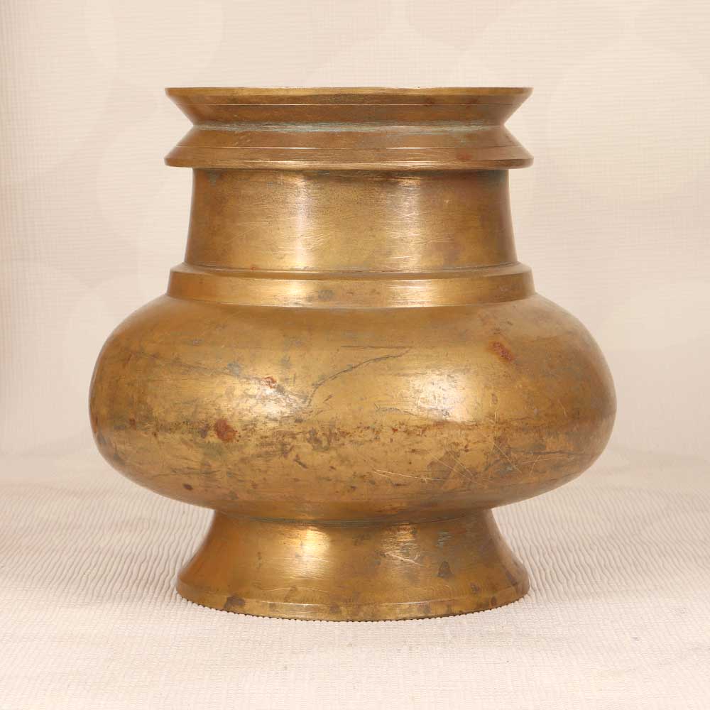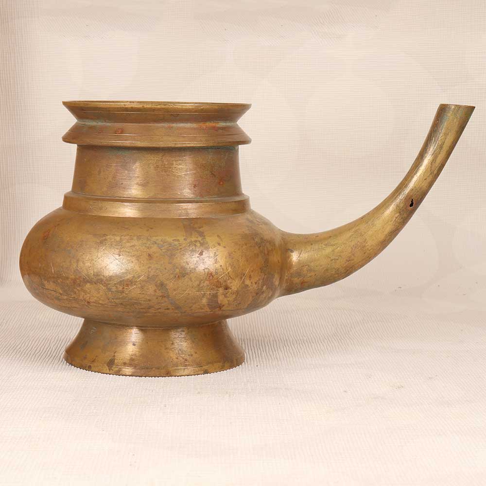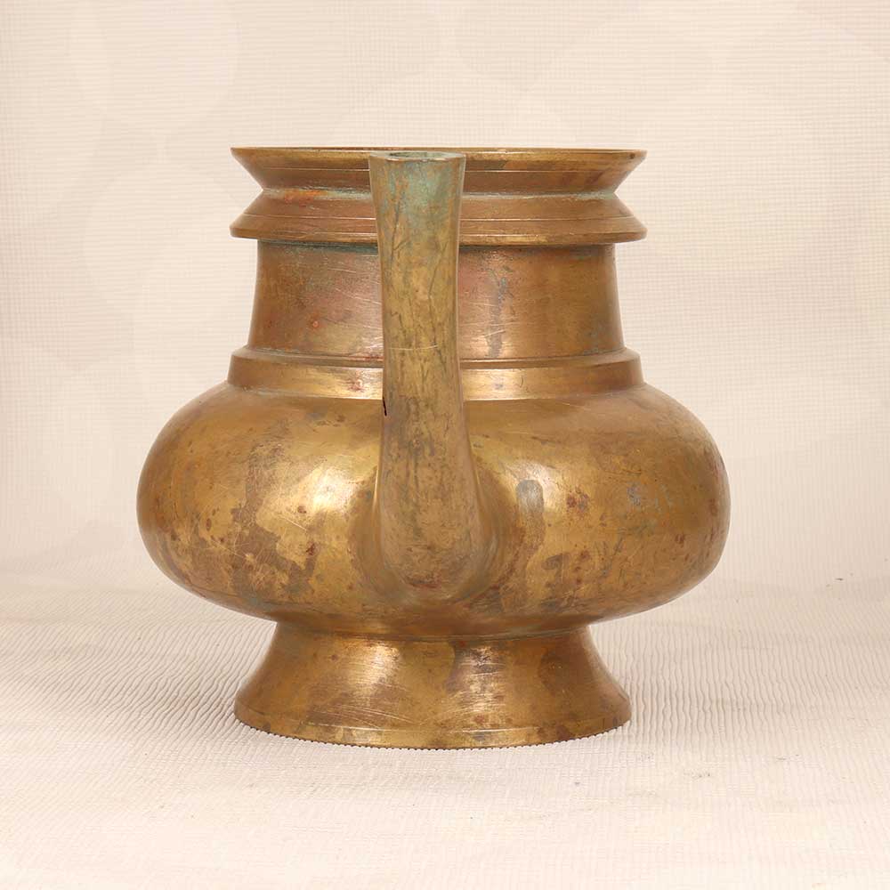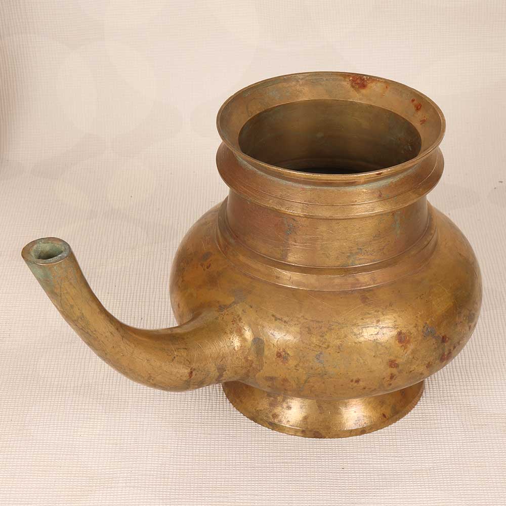 Bless your home and loved ones with this antique brass holy water vessel from South India. Featuring delicate hand-worked brass and a gracefully arching spout, this pot elevates religious rituals with vintage elegance. Bring spiritual tradition into your home with this handcrafted brass holy water pot. Its vintage styling and ornate shape lend a timeless grace to religious rituals, allowing you to anoint with elegance. Pour blessings upon yourself, family and friends with the gracefully curving spout that gives you complete control over the holy water's flow. For those wanting to honor religious heritage or add spiritual resonance to their home, this antique brass pot is perfect. Use it to create a meditation space or heighten the sacredness of religious gatherings. The aged patina and craftsmanship give it an irresistible vintage charm.