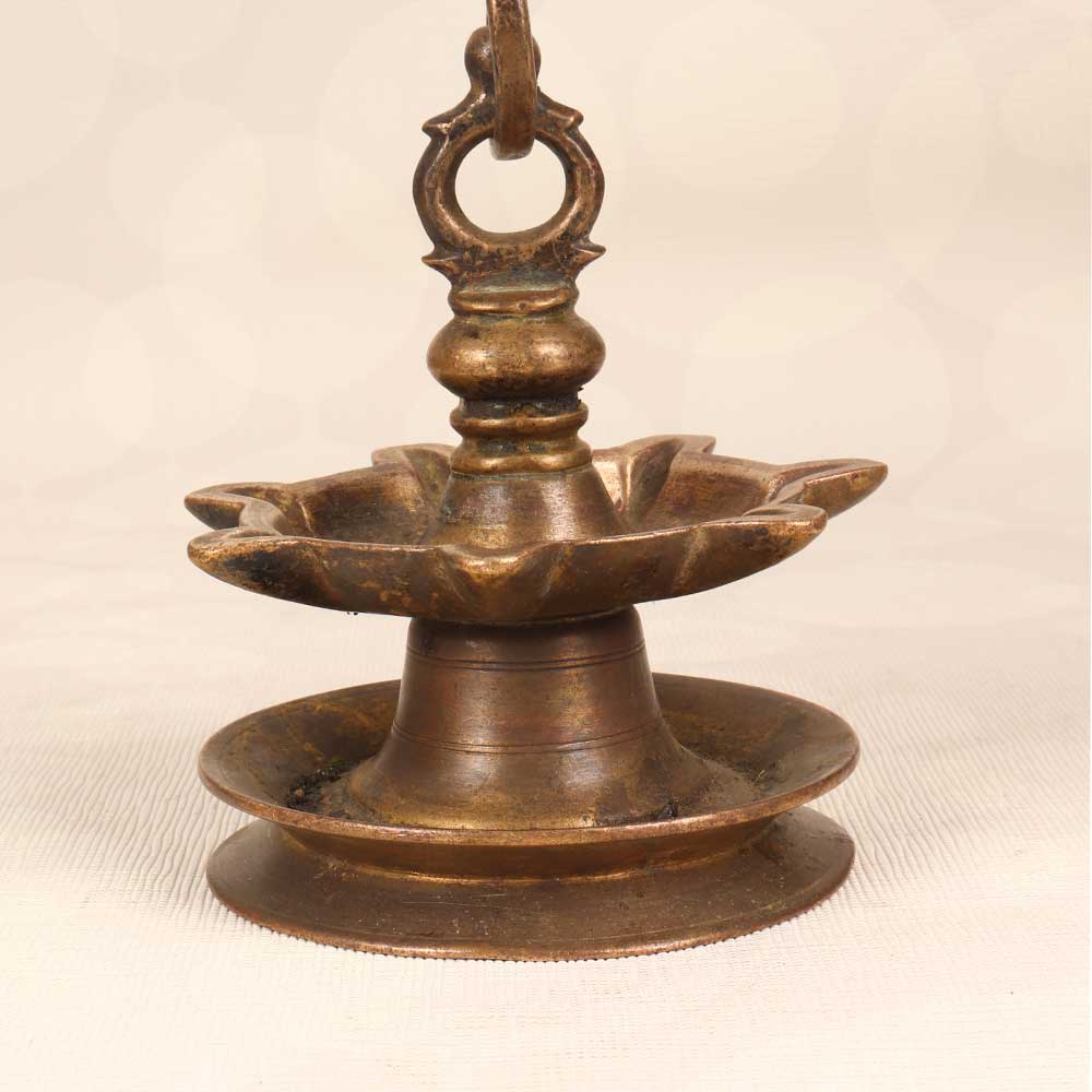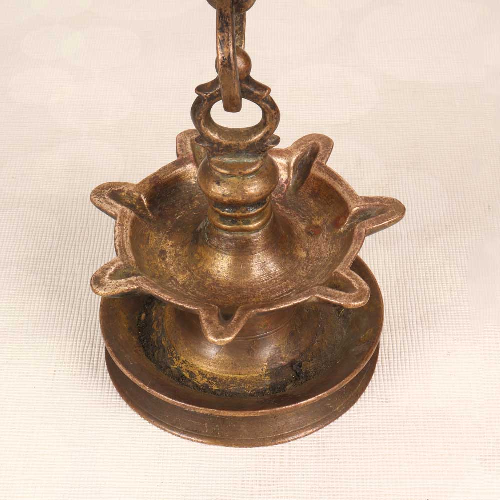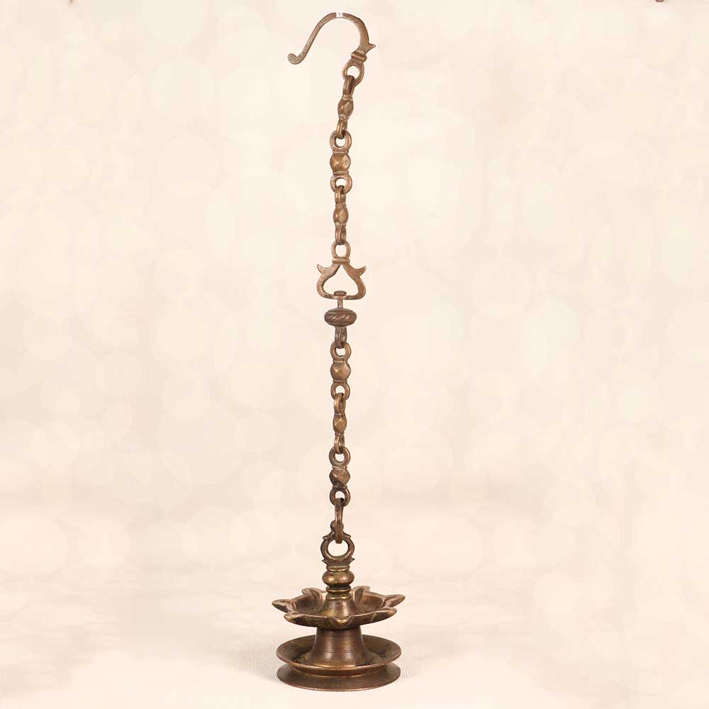 Step back in time with the nostalgic glow of this vintage brass hanging oil lamp. Handcrafted using centuries-old techniques, its intricately embossed body and 7 golden flames evoke the romance of an ancient Indian haveli. Recreate the magic of old India in your home with this lamp's romantic golden light. Its ambient glow sets the mood for intimate dinner parties, relaxing yoga sessions, or just curled up with a good book. The sturdy brass body illuminates any room with antique elegance. For lovers of artisanal decor and anyone seeking an enchanting focal point, this handcrafted lamp brings history to life. Who will love it: Bohemian style enthusiasts, antique collectors, and those seeking unique statement lighting with old-world charm.