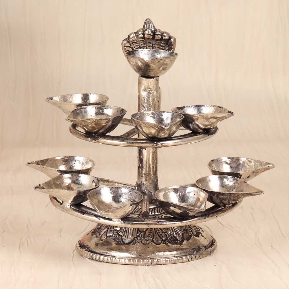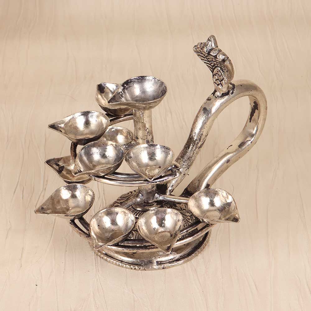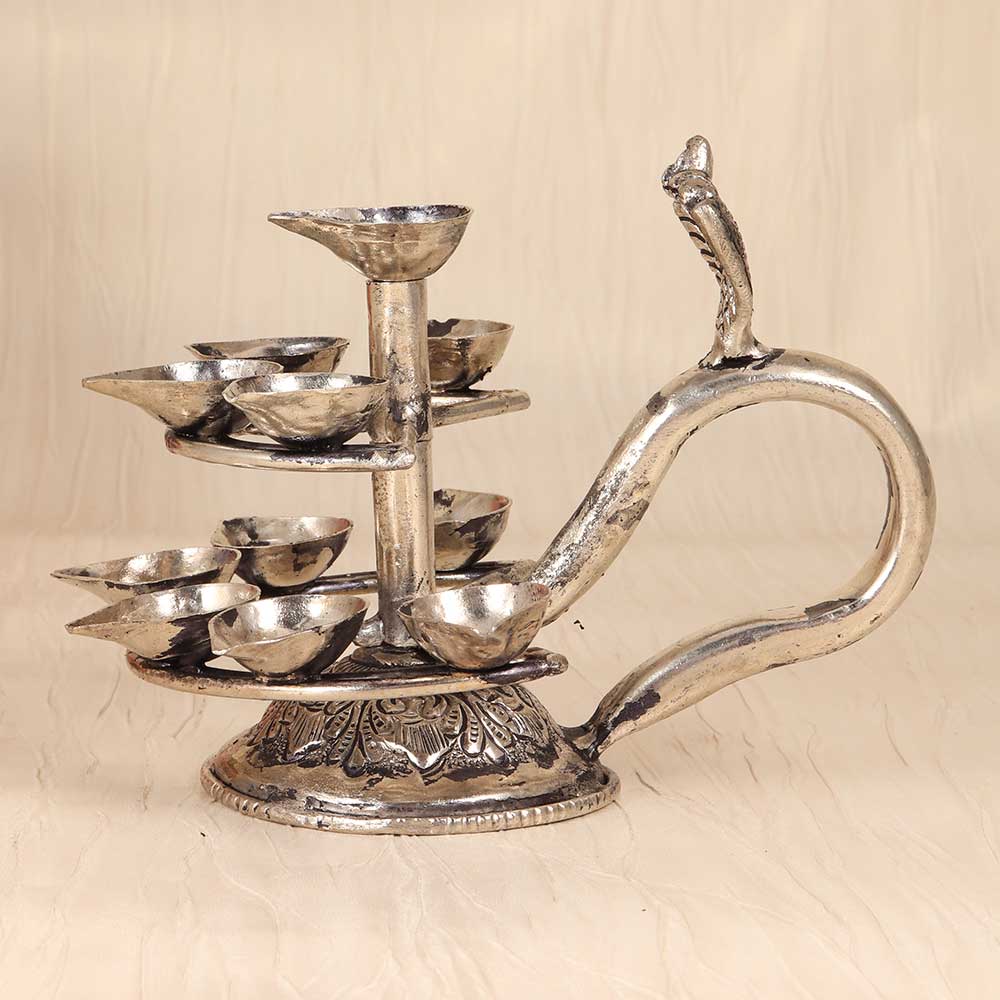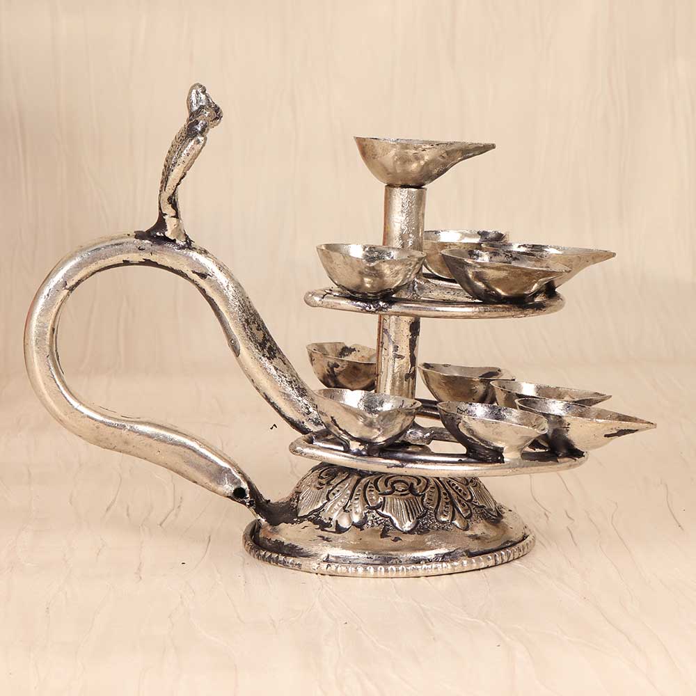 Experience the warmth and glow of tradition with this vintage brass nickel plated aarti oil lamp. Handcrafted with an ornate cobra handle design, this lamp makes a stunning ceremonial piece. Create a sacred ambiance during your daily puja or special celebrations with this handcrafted lamp. The 11 jyots represent divinity and will fill your home with peace and positivity. Keep your spiritual roots close with this vintage lamp that connects you to your heritage. The glow of the flames lit with mustard oil or ghee and cotton wicks will become a warm reminder of the traditions you hold dear.