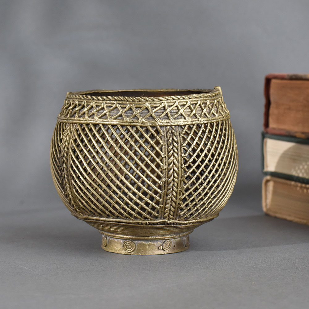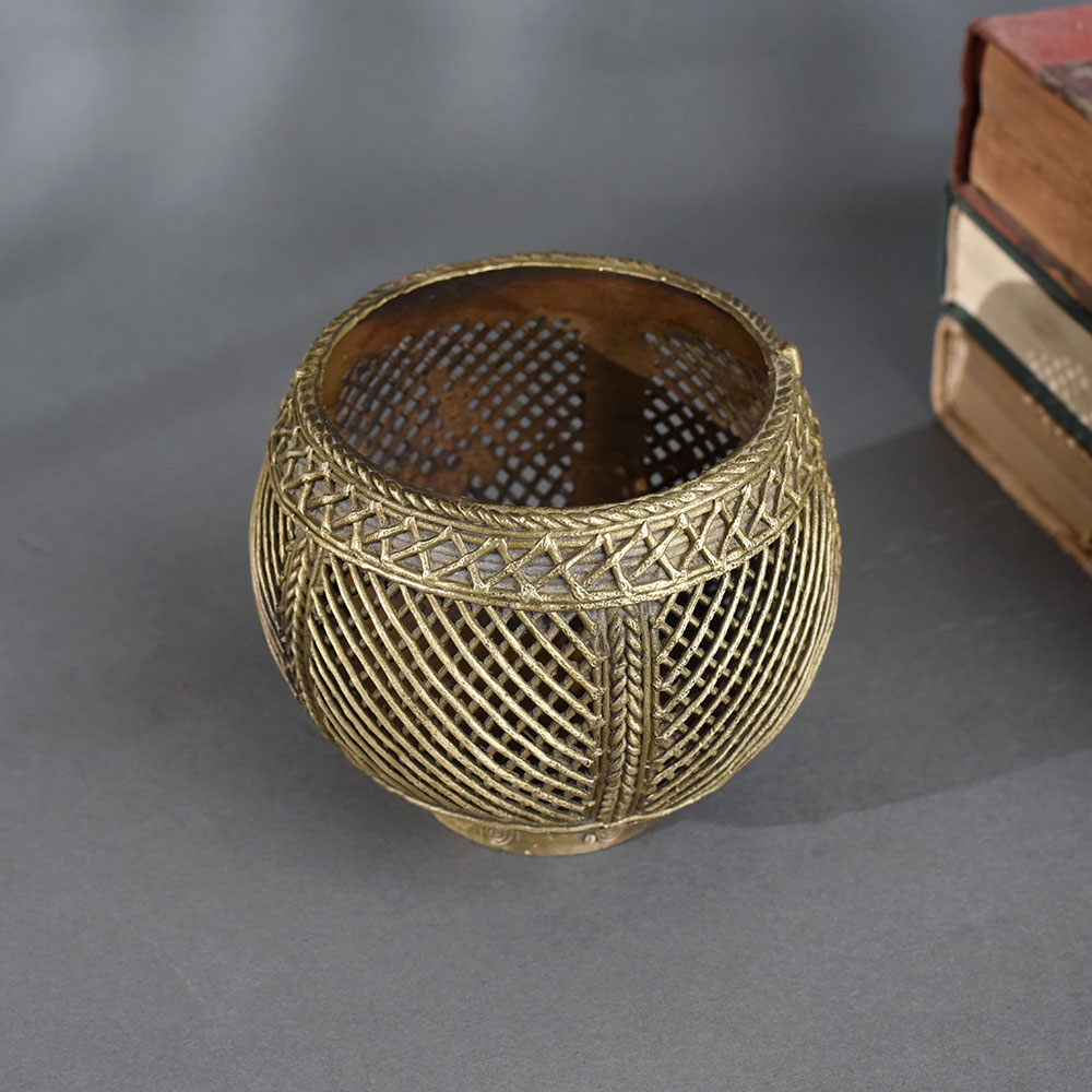 This handcrafted brass measuring pot from Odisha is a stunning example of traditional Indian artistry. Designed with a detailed open lattice pattern, it blends utility and elegance in one timeless piece. Originally used in rural India for measuring grains, this pot now makes a unique decorative item for homes, cultural spaces, or collections. The geometric mesh-like structure showcases exceptional metalwork techniques passed down through generations. Its warm golden hue and symmetrical detailing make it perfect for adding texture and character to any ethnic or rustic interior setup.