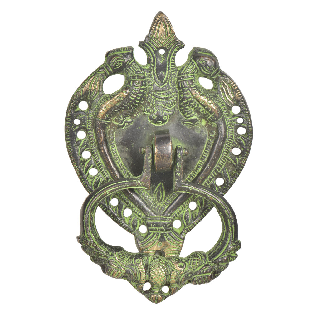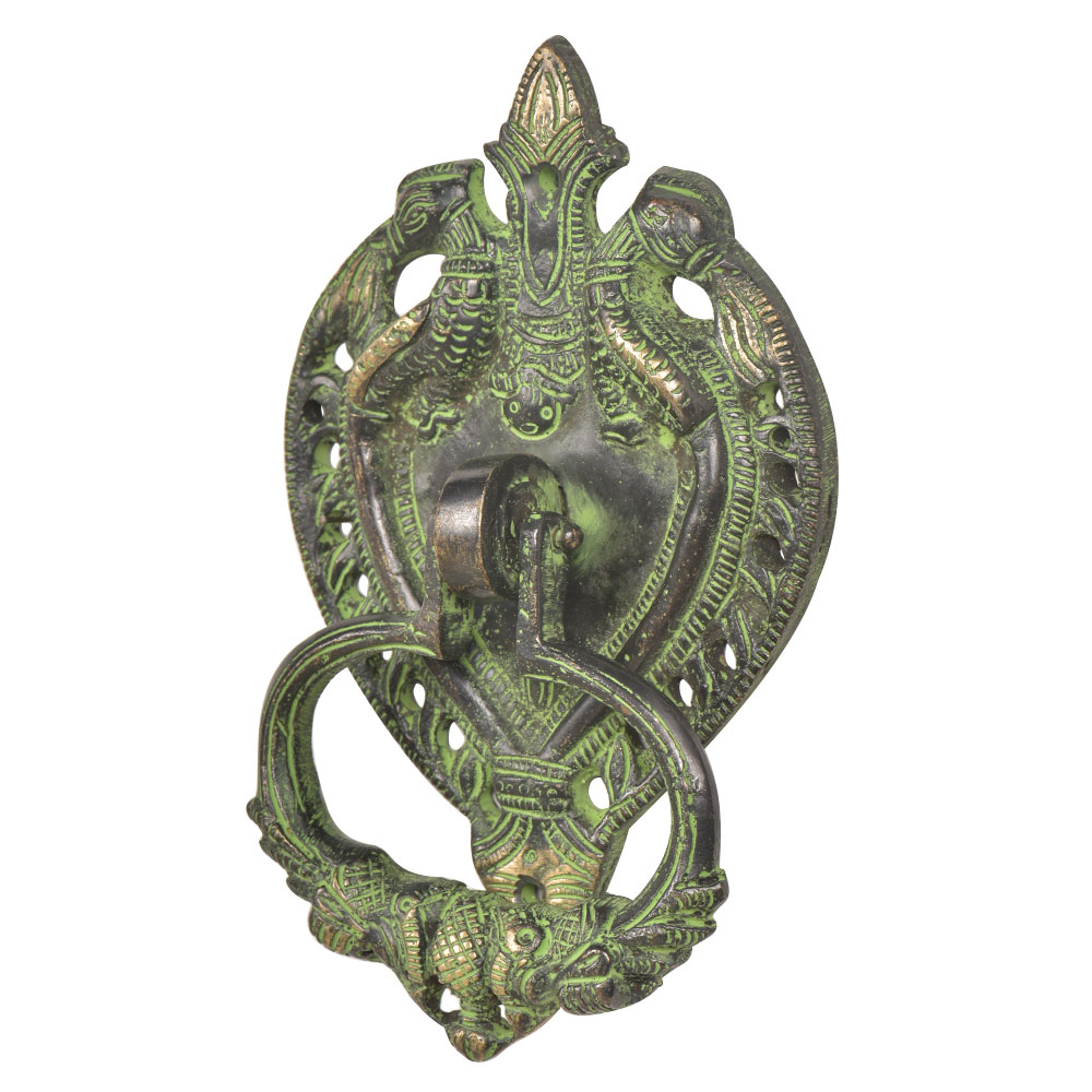 A very heavy and decorative brass knocker with the demons face on top and two Lions on both sides with the knocker attached to the Ram head with a strike plate. An elegant vintage decor item.