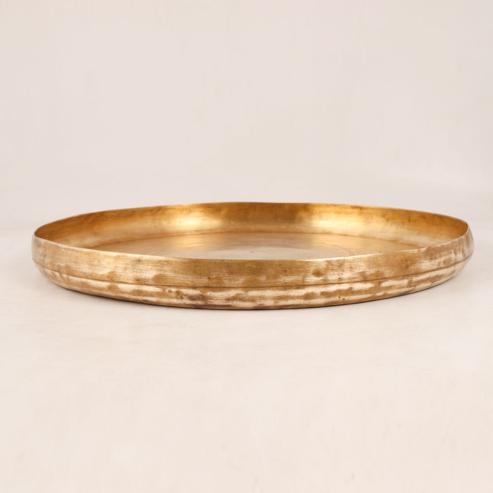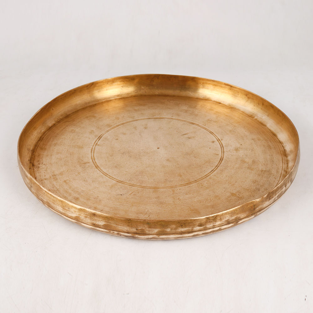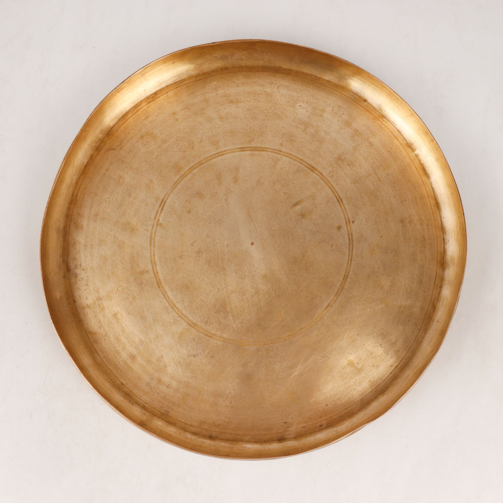 Experience the timeless allure of our exquisite Bell Metal Plate or Thali, a true embodiment of artistry and craftsmanship. Handmade by talented Indian artisans hailing from the enchanting land of Himachal Pradesh, this plate resonates with history and tradition. Made from high-quality bell metal, its antique golden finish imparts an aura of vintage grandeur. Originally designed for serving food, this plate now stands as a symbol of heritage and charm. Its intricate detailing and graceful curvature evoke a sense of nostalgia, perfect for adorning your living space, office, restaurant, hotel, or cafe. While its culinary purpose has evolved, its beauty remains everlasting. Whether gracing an exhibition or nestled within a vintage collection, this bell metal plate narrates a story of cultural opulence. As a thoughtful gesture, it makes for an exceptional gift on special, festive, or auspicious occasions, allowing you to share the elegance of tradition with your loved ones. Embrace the allure of the past while celebrating the present through this masterpiece of art and culture.