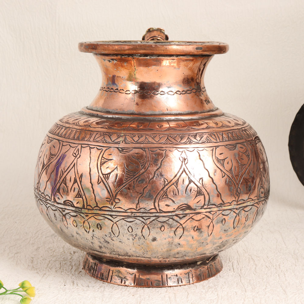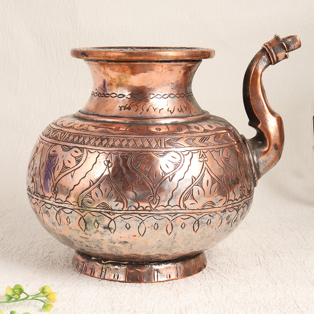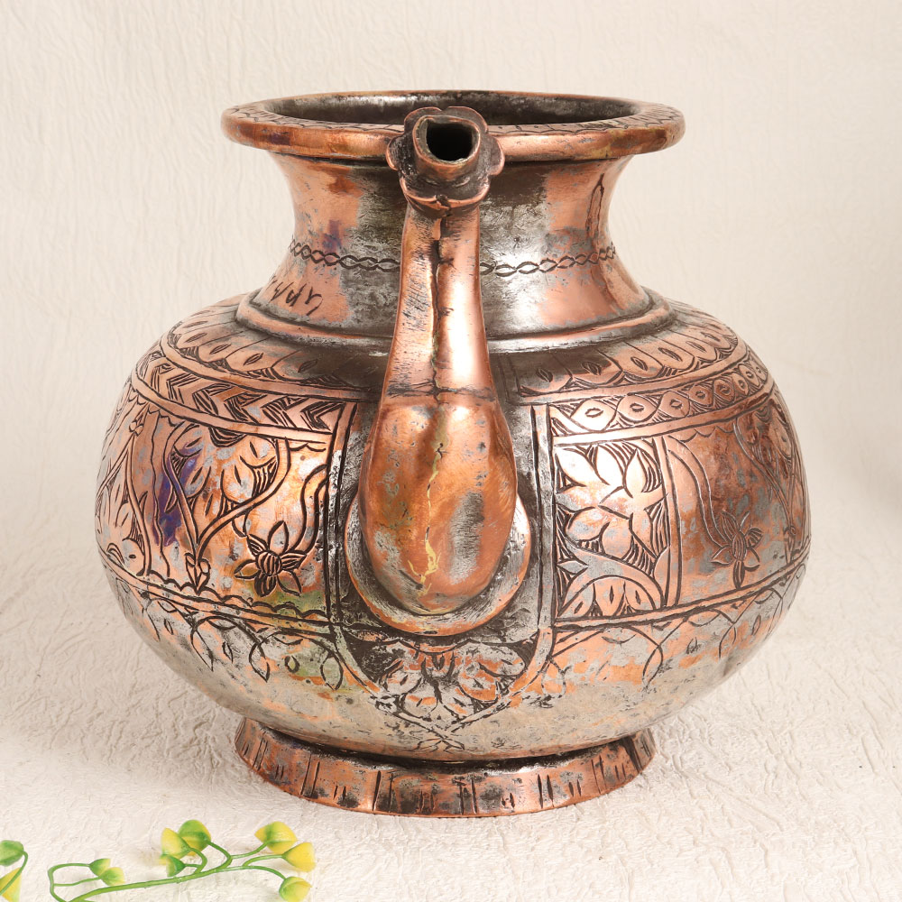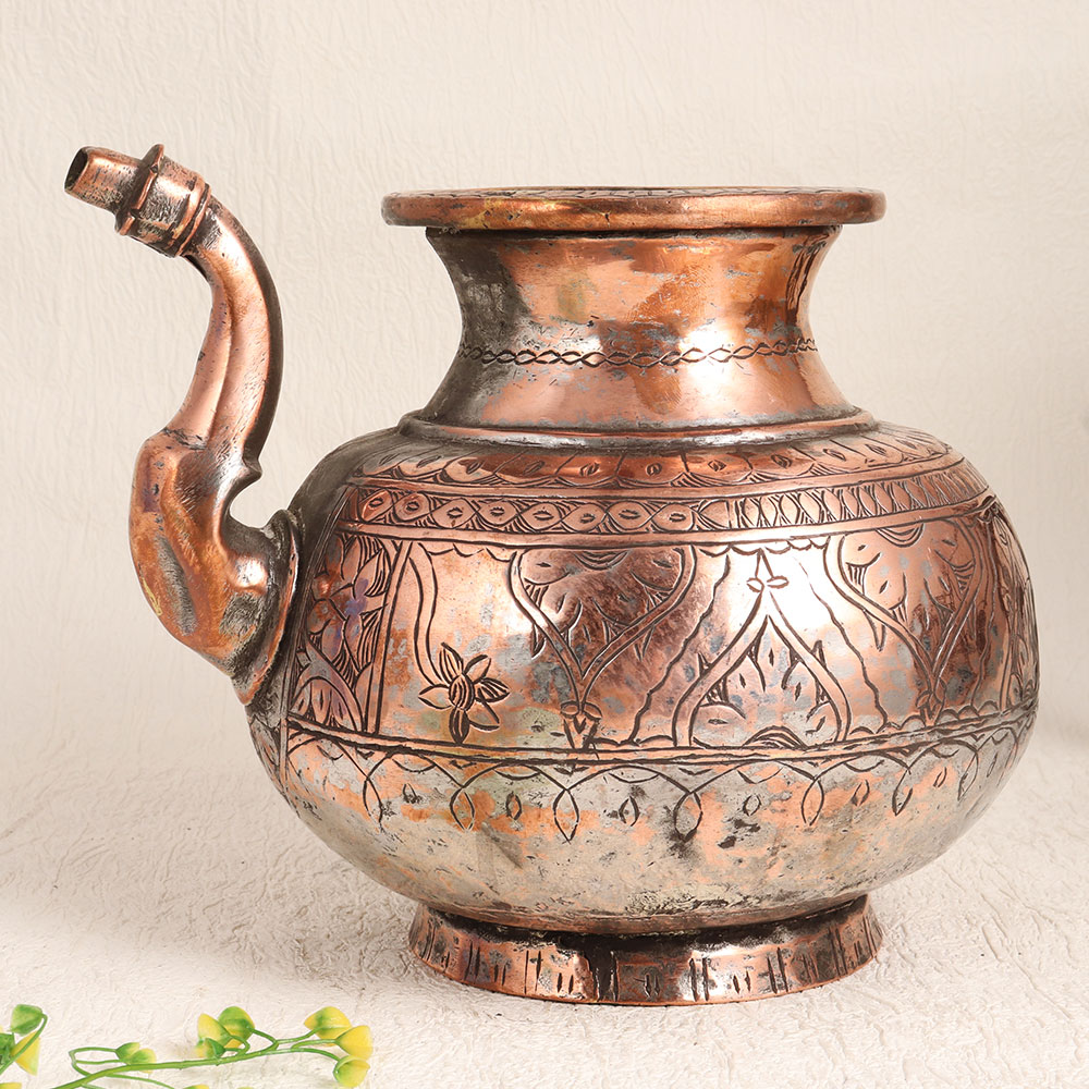 This Vintage Copper Holy Water Pot is a true masterpiece of Islamic Artistry. Handcrafted with meticulous attention to detail by talented artisans, this exquisite piece showcases the rich heritage of craftsmanship that dates back centuries. Made from high-quality copper, this pot boasts a warm antique brown finish that adds a touch of rustic charm to any setting. Its intricate engravings tell stories of faith and culture, making it a cherished piece for collectors and enthusiasts of vintage art. Versatile in its application, this holy water pot features a convenient spout, making it suitable for use in various settings, including your home, office, restaurant, hotel, cafe, or shop. Use it for decoration to infuse an air of sophistication or as a unique flower pot that blends tradition with nature. Furthermore, this pot is not just a decorative piece but also serves a sacred purpose during havan, prayer, or temple rituals. If you're a collector, this vintage copper pot is a must-add to your collection, and it can also be proudly displayed at exhibitions to share its historical significance. Consider gifting this remarkable piece to your family, friends or relatives on special, festive, or auspicious occasions. Embrace the heritage and beauty of Islamic art with our Vintage Copper Holy Water Pot.