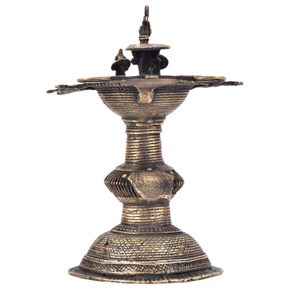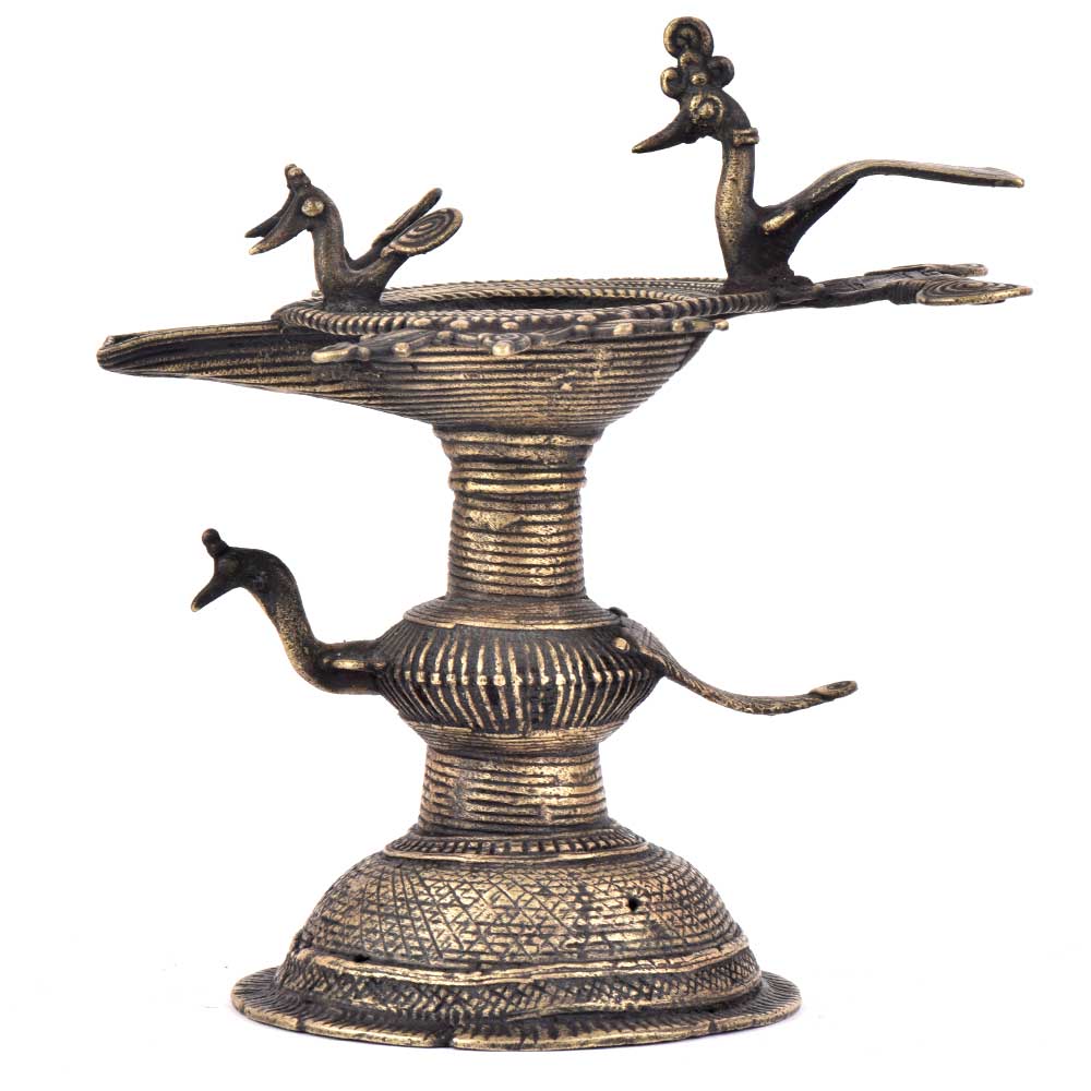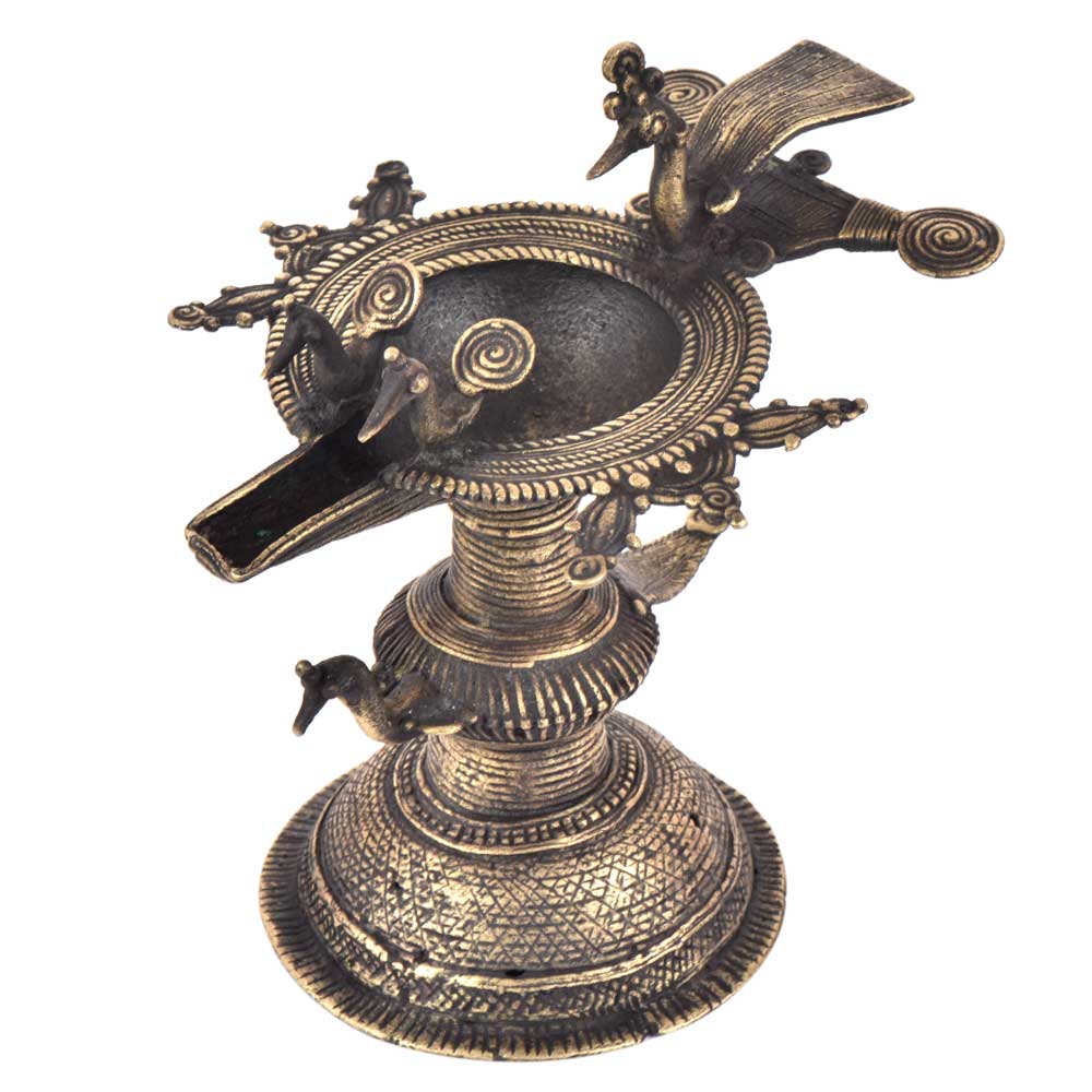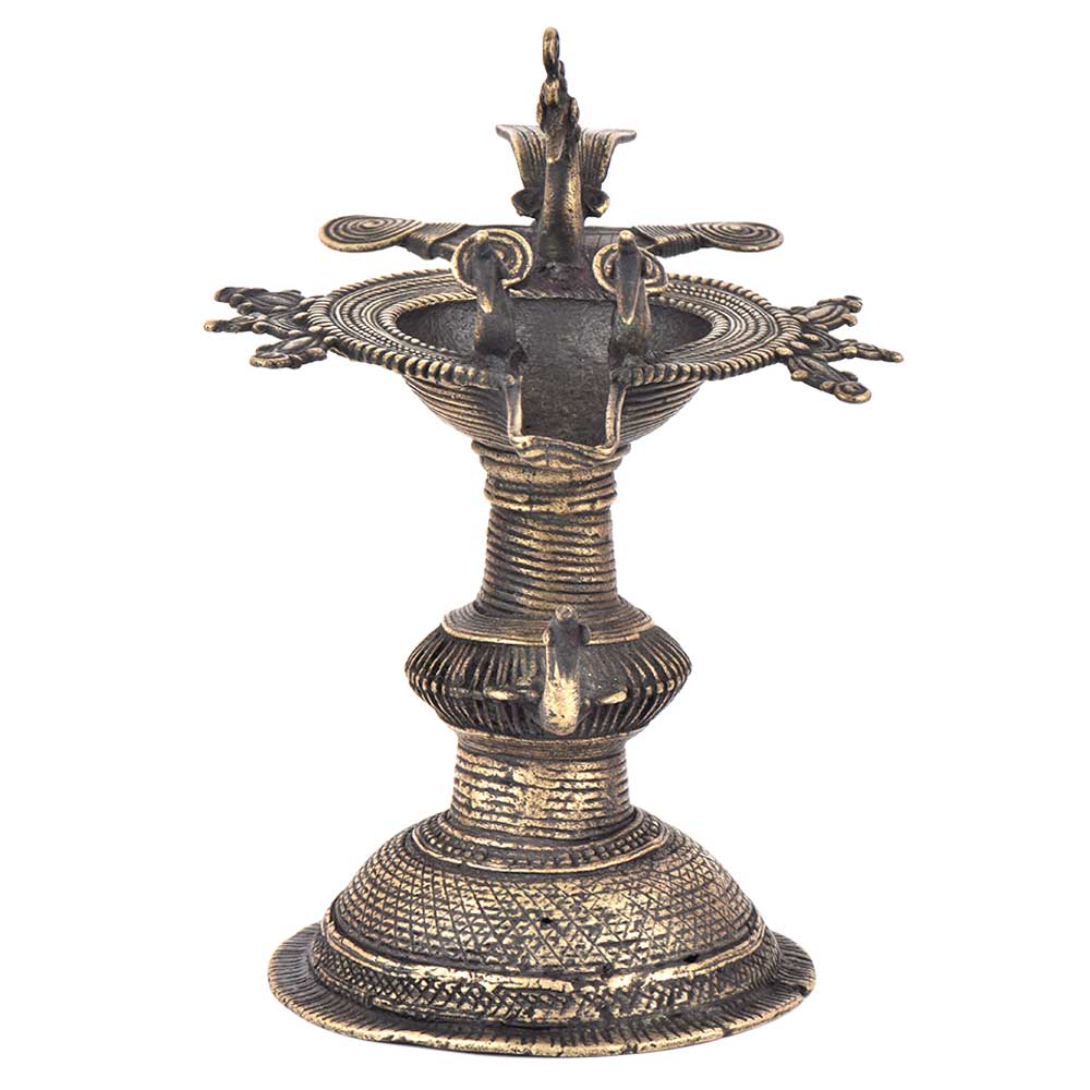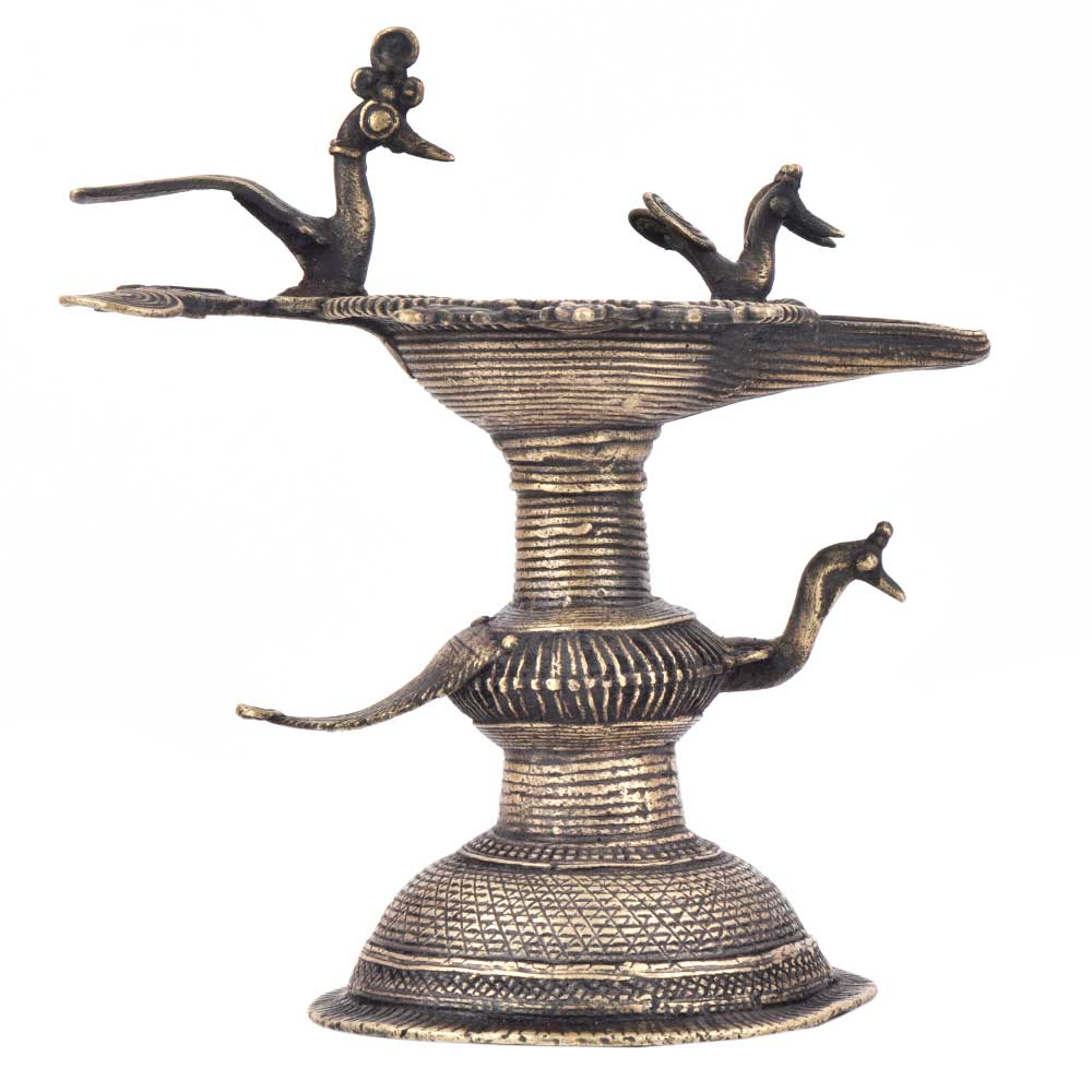 Handcrafted using old lost wax technique primarily practiced in Orrisa and West Bengals by the local or tribal artisans. In this technique the molten wax is poured into desired clay mould and when the wax melts the clay is broken and we get the desired metal object which is further polished to perfection. The Deep Cup Can Be Filled with Oil and Light a Cotton Wick. Diyas/ Oil Lamps are Considered Auspicious as in Hindu Religion. It is detailed with Elephant and Peacock Animals with Beautiful Details.