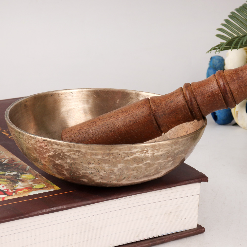 Discover the beauty of mindfulness with this Om singing bowl and wooden mallet set. The bowl's resonant sound and gentle vibrations create a peaceful atmosphere, perfect for meditation and self-care. Buy this om singing bowl online from our website and get a hassle-free delivery at your doorstep. It is handcrafted by skilled Indian artisans with attention to detail, this exquisite bowl plays the Om sound, relaxing the mind and helping in meditation. It is made of high quality bell metal that leaves a long lasting impression to the interior. It comes with a wooden mallet for easy playing, making it a thoughtful gift for loved ones who seek balance, serenity, and spiritual connection.