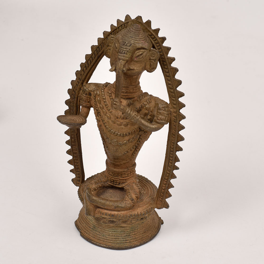 Adorn your home with the divine presence of Lord Ganesha through this stunning brass statue. Crafted with meticulous attention to detail, this piece embodies the essence of the revered elephant-headed deity, renowned for his ability to remove obstacles and bestow prosperity. The intricately carved design, inspired by the rich tribal art traditions of Odisha, elevates this brass Ganesha into a true work of art. From the ornate headdress to the gracefully posed limbs, every element of this statue radiates a sense of spiritual serenity and timeless beauty. Whether placed on a mantel, side table, or altar, this brass Ganesha will become a cherished focal point, infusing your space with the blessings and protection associated with this beloved Hindu deity. Invite the wisdom, abundance, and good fortune of Lord Ganesha into your life and create a sanctuary of peace and positivity in your home.