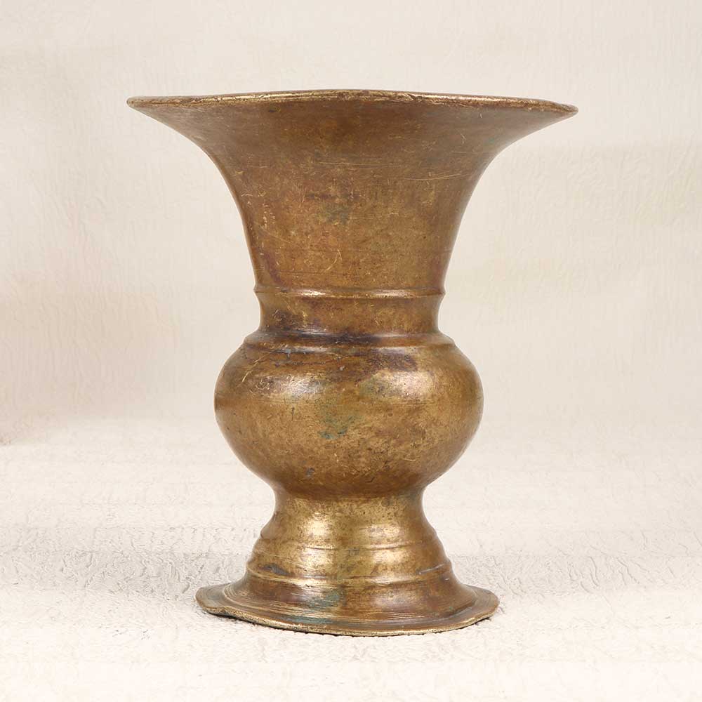 Make a bold statement with this exquisite brass flower pot exhibiting the intricate artistry of South Indian motifs. With its hand-etched patterns and vintage brown finish, this pot brings a touch of bohemian charm into your home. This brass pot features the impeccable craftsmanship of delicate floral and geometric designs found in traditional South Indian Art. Place it prominently on your entryway table or bookshelf to invite conversation and compliments. The pot's unique shape and detailed etchings give it an exotic, worldly look. For those who appreciate artistic accents and cultural crafts, this brass flower pot makes a meaningful addition to any space. Its handmade quality gives it an heirloom feel, making it a treasured gift for free spirits.