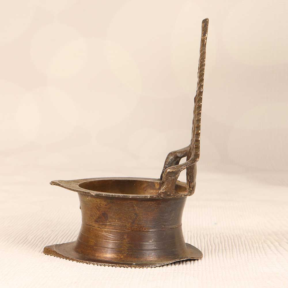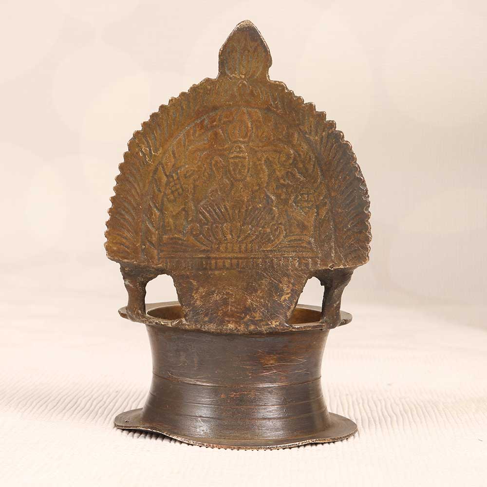 Radiate fortune and beauty with this antique brass Gajlaxmi Oil Lamp. Crafted in the traditional style of South Indian artisans, this lamp depicts the elephant-headed Goddess Lakshmi. Her trunk reaches up to shower blessings upon devotees. Light up your home with Lakshmi's divine glow. The soft flicker of the lamp creates a soothing ambiance perfect for meditation, yoga, Puja, or Diwali celebrations. Place upon your altar or in your Puja room to invite Lakshmi's prosperity. Bring an heirloom piece into your home with this gorgeous vintage Gajlaxmi lamp. The quality brasswork will last for generations. A meaningful gift for Hindu family and friends.
