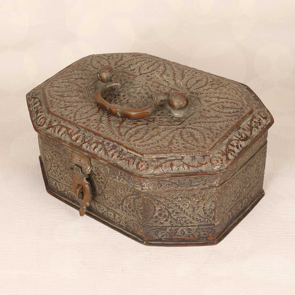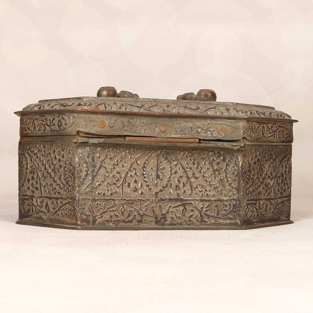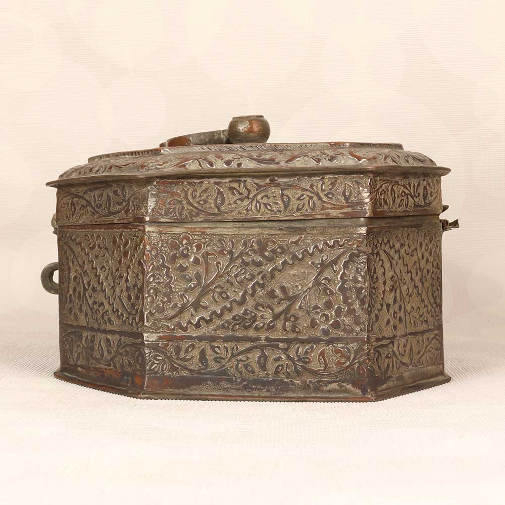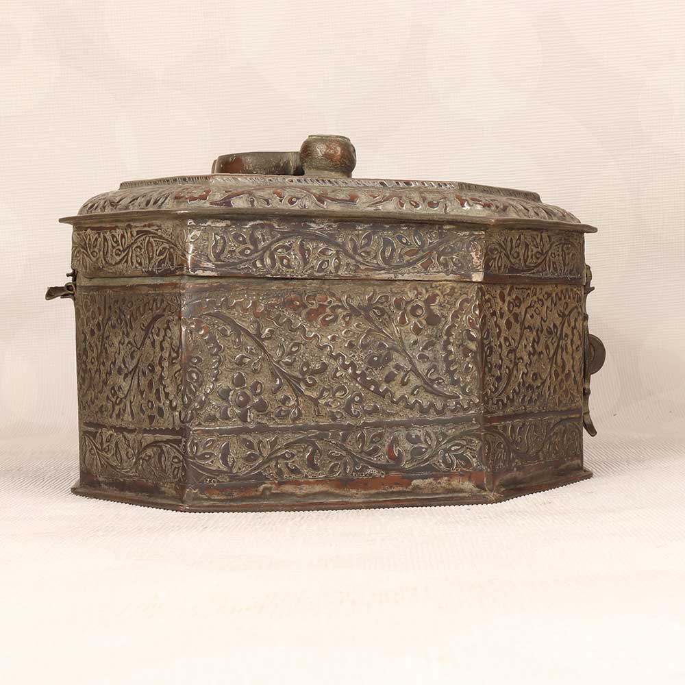 This antique copper Paan Daan from Hyderabad brings old world charm to any space. Hand-engraved with intricate Islamic motifs, it's a work of functional art. With its elegant engraved details and aged patina, this Paan Daan is an elegant way to continue the tradition of serving paan. The dark patina on the pure copper develops over time, adding warmth and character. Whether you appreciate Islamic art, want to honor Indian traditions, or simply value unique home decor - this vintage Paan Daan makes a striking statement. Use it to serve paan to guests or display it as a decorative accent piece. The ornate engraving reflects rich craftsmanship that is sure to impress. For a meaningful antique with old world allure, this copper Paan Daan brings tradition to life through stunning Islamic art.