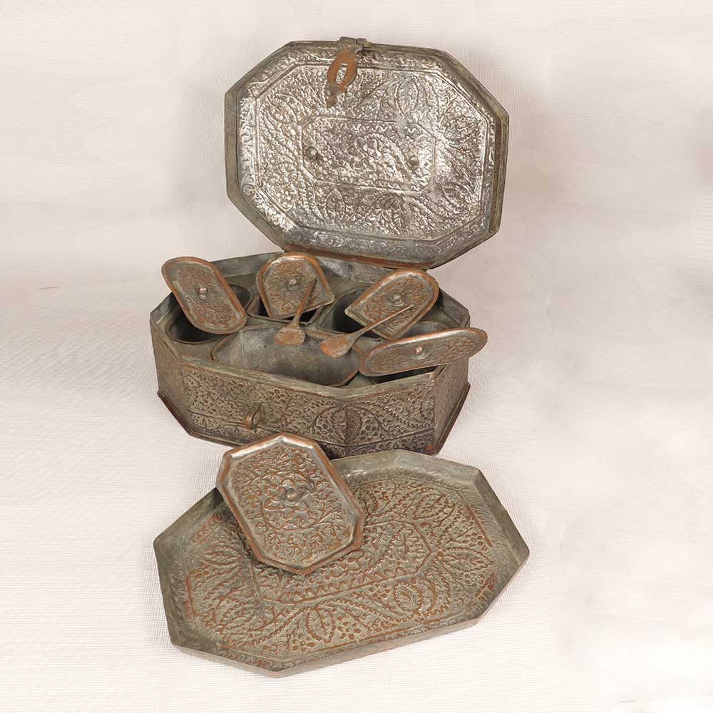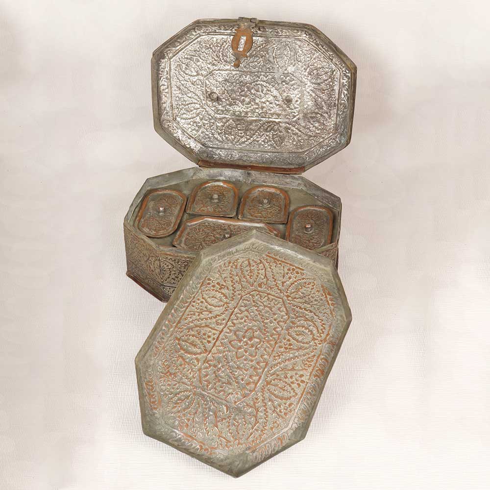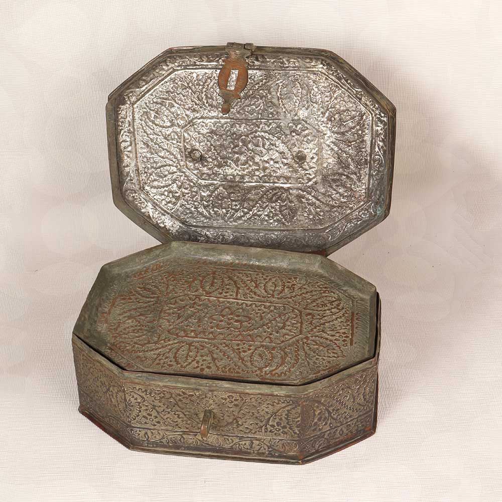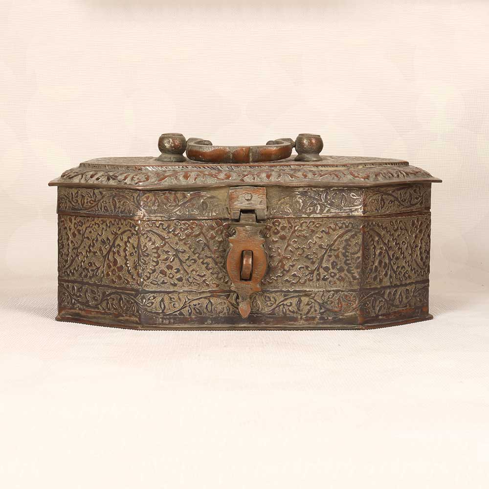 This antique copper Paan Daan from Hyderabad brings old world charm to any space. Hand-engraved with intricate Islamic motifs, it's a work of functional art. With its elegant engraved details and aged patina, this Paan Daan is an elegant way to continue the tradition of serving paan. The dark patina on the pure copper develops over time, adding warmth and character. Whether you appreciate Islamic art, want to honor Indian traditions, or simply value unique home decor - this vintage Paan Daan makes a striking statement. Use it to serve paan to guests or display it as a decorative accent piece. The ornate engraving reflects rich craftsmanship that is sure to impress. For a meaningful antique with old world allure, this copper Paan Daan brings tradition to life through stunning Islamic art.