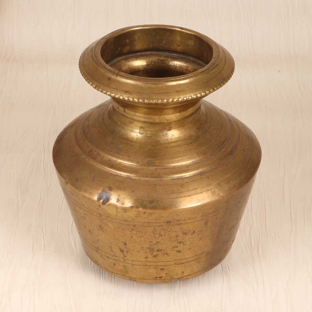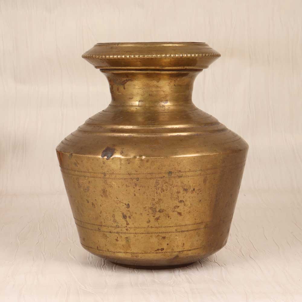 Sanctify your home with this antique-styled South Indian brass holy water pot. Featuring a minimalist design, this elegantly curved vessel has a timeworn patina that adds character. With its understated yet captivating form, this brass pot elevates any shelf or tabletop while providing a sacred vessel for holy water. The vintage patina finish gives the pot a well-loved, timeworn look that feels like a family heirloom. Keep it near your home's entrance or in your prayer space to sanctify your home and family with blessings. This pot makes a thoughtful, meaningful gift for religious celebrations, housewarmings, and those who cherish cultural relics. Let its minimalist elegance and spiritual symbolism infuse peace into your home.