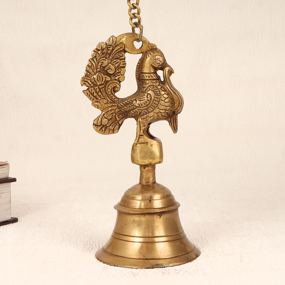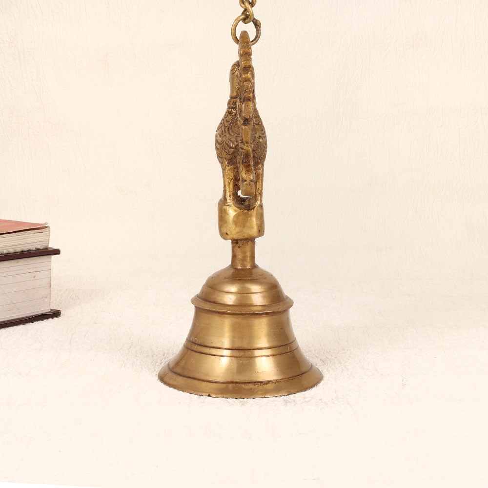 This Vintage Bell Metal Hanging Temple Bell adorned with a majestic peacock carving atop is meticulously handcrafted by highly talented Indian artisans hailing from Central India. Crafted from high-quality bell metal, this exquisite bell captures the essence of traditional craftsmanship, offering a nostalgic touch with its antique brown finish. Ideal for adorning temples or prayer rooms, this bell comes complete with a chain for easy hanging, creating an ambience of serenity and spirituality. Beyond religious spaces, this versatile piece seamlessly complements various settings such as homes, offices, restaurants, hotels, or cafes. Its aesthetic allure extends beyond functional use, making it a splendid decorative item that effortlessly blends into any vintage-themed collection. The bell serves as an eloquent gift choice for your family, friends or relatives during special, festive, or auspicious occasions, embodying the richness of Indian heritage and artistry. Each ring resonates with the history and craftsmanship passed down through generations, offering a unique blend of cultural significance and timeless beauty. Elevate your surroundings with this exceptional Vintage Bell Metal Hanging Temple Bell, a testament to the enduring charm of handmade Indian artefacts.