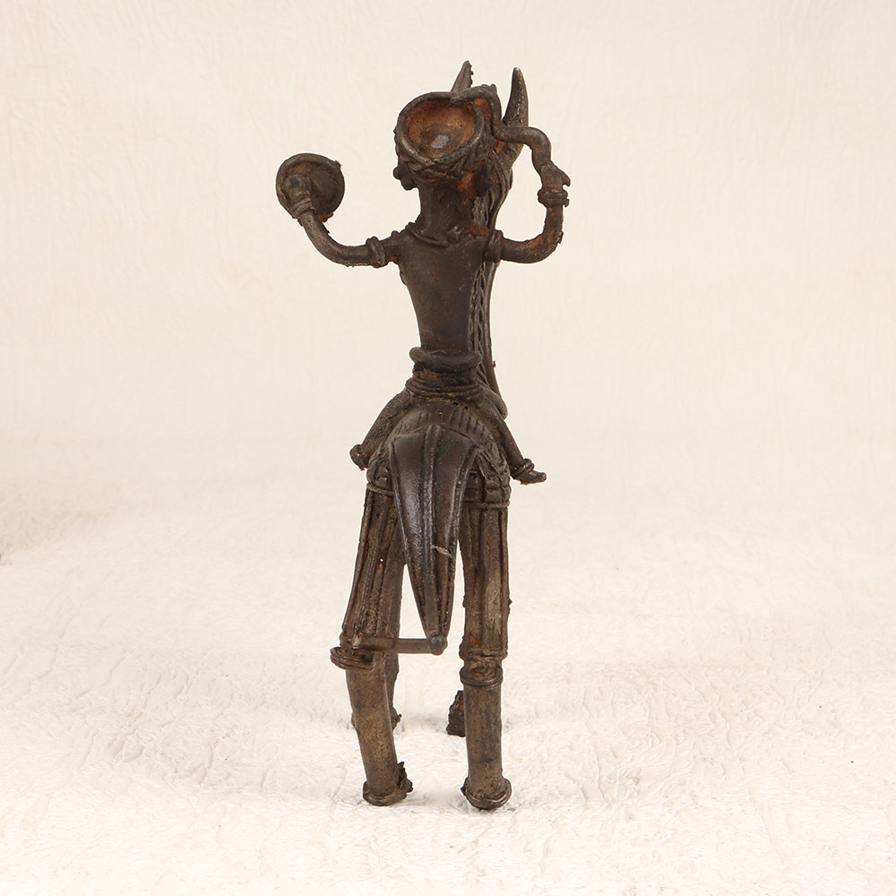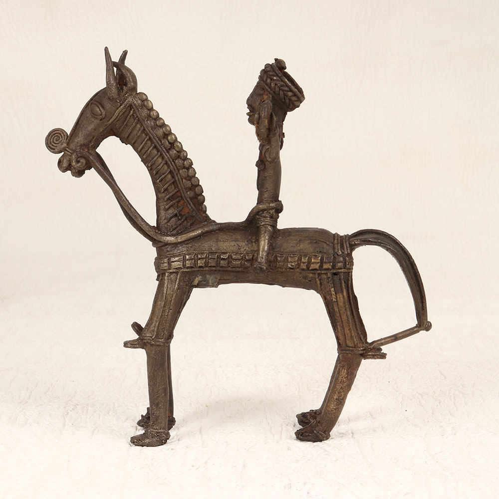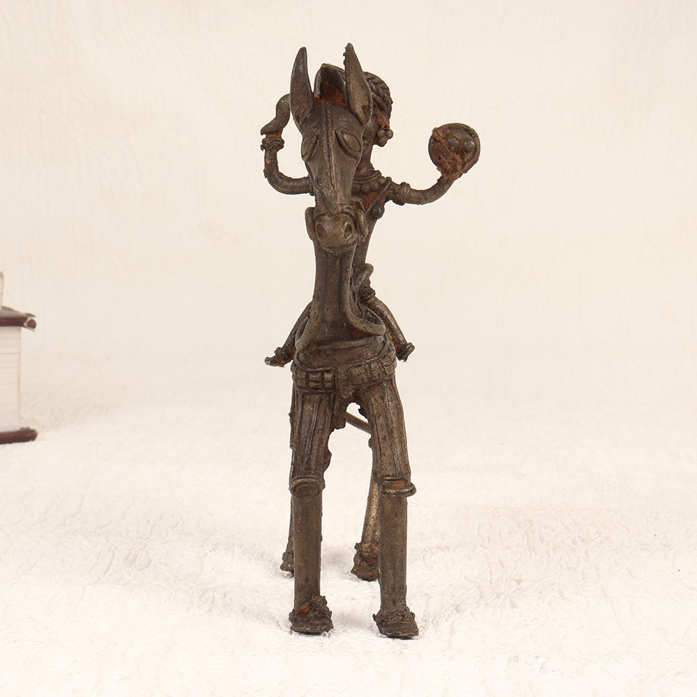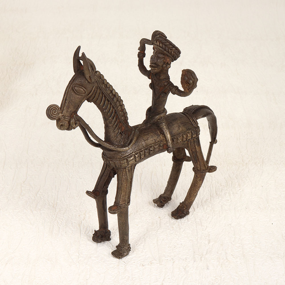 Experience the enchanting allure of cultural craftsmanship with our Vintage Brass Horse and Rider that is a masterpiece meticulously handcrafted by professional artisans from Bengal, India. This exquisite piece showcases tribal artistry, seamlessly blending tradition with timeless elegance. Cast in high-quality brass, its antique brown finish imparts a warm and nostalgic aesthetic, evoking a sense of heritage. Perfect for adorning diverse environments, this unique creation effortlessly enhances the ambiance of homes, offices, restaurants, hotels, or cafes. Its versatile appeal transcends settings, making it an ideal addition to your vintage collection. Beyond personal enjoyment, this captivating piece also makes for a thoughtful and meaningful gift for your family, friends or relatives during special, festive, or auspicious occasions. Embrace the rich history and cultural tapestry embodied in this handmade treasure, bringing a touch of Indian artistry to your surroundings.