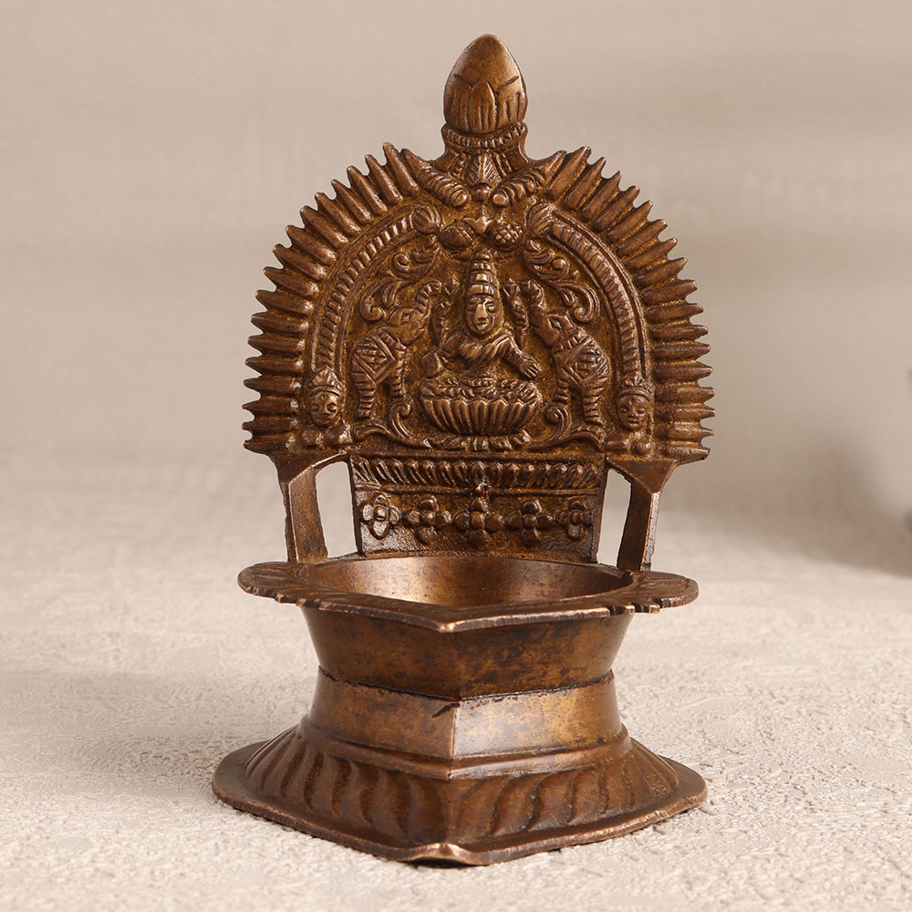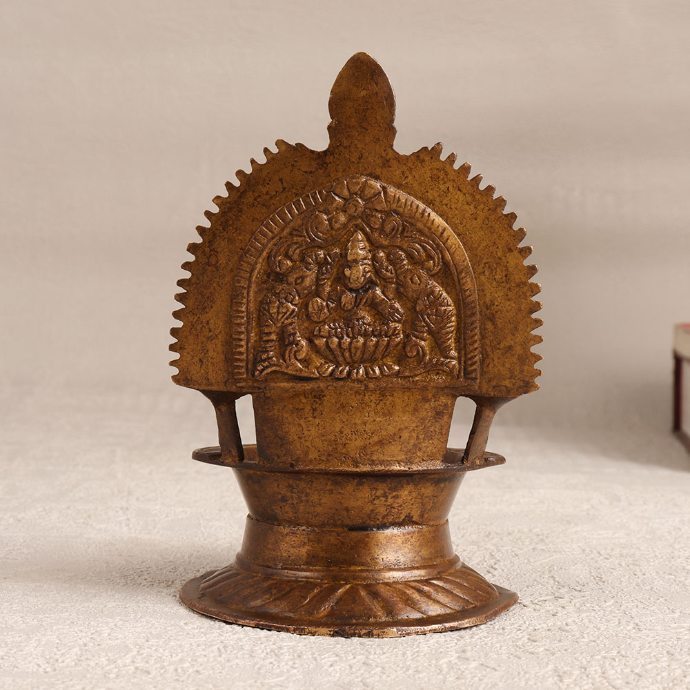 Buy a Vintage Brass Gajlakshmi Oil Lamp online which is a captivating blend of artistry and spirituality. Also known as the Gajlaxmi oil lamp, this timeless piece is meticulously handcrafted by highly talented Indian artisans from premium-quality brass. Its antique brown finish exudes an old-world charm that transports you to a bygone era. Designed for sacred moments, this lamp is a perfect accompaniment to your prayers, radiating a warm and serene glow when lit with either mustard oil or ghee using a cotton wick. The Gajlakshmi motif, symbolizing prosperity and divine blessings, adds a spiritual touch to your prayer space. Versatile and elegant, this lamp finds its place not only in homes but also in offices, restaurants, hotels, and cafes - ideal for creating a tranquil ambiance in prayer rooms. Its antiqued beauty makes it a striking addition to any vintage collection, seamlessly blending tradition with contemporary aesthetics. Celebrate special, festive, or auspicious occasions by gifting this Vintage Brass Gajlakshmi Oil Lamp to your family, friends or relatives. Embrace the timeless elegance and cultural significance that this meticulously crafted piece brings, creating an enduring connection between the past and the present.