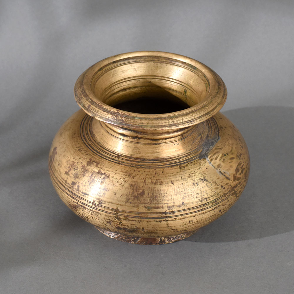 Immerse yourself in the spiritual heritage of South India with this traditional Brass Holy Water Pot (Lota), a sacred vessel used in daily rituals, temple offerings, and puja ceremonies. Handcrafted by skilled artisans, this vintage pot is made from solid brass and features a beautifully aged patina that speaks to its authenticity and cultural significance. Its rounded body and wide mouth are designed for practical use during rituals, making it ideal for storing and dispensing holy water (tirtha) or other sacred liquids. The subtle engraved lines add character, while the natural weathering gives it an antique finish that enhances its traditional charm. Whether used in religious ceremonies or as a decorative accent, this pot embodies the spiritual essence and craftsmanship of South Indian temple traditions. This brass holy water pot also serves as a meaningful collectible for devotees, antique lovers, and those seeking a genuine piece of Indian cultural heritage. Perfect for temple décor, altars, or ethnic interiors.