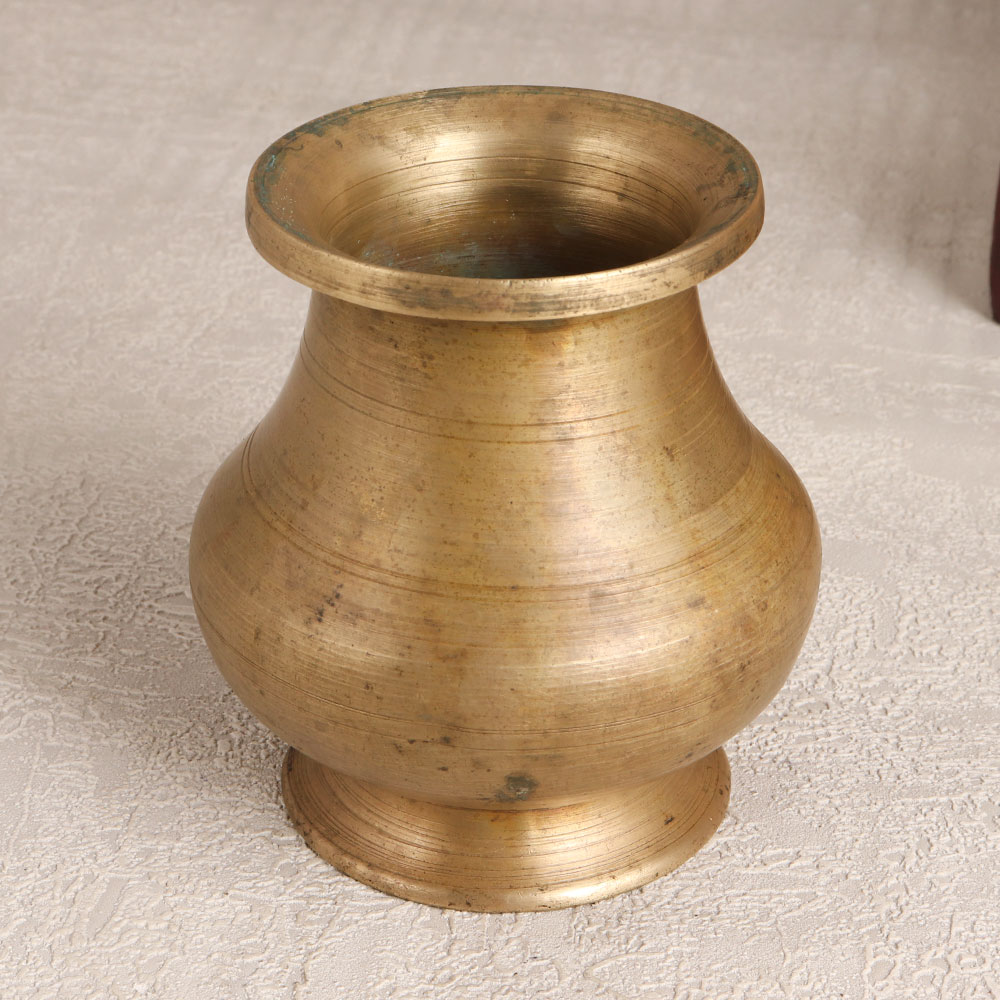 Imbued with spiritual significance and crafted with meticulous artistry, this vintage brass holy water pot is a testament to South Indian craftsmanship. Its timeless design, featuring an antique brown finish, resonates with the rich traditions of prayer, havan, and rituals. Handmade by talented Indian artisans from high-quality brass, this versatile pot serves a dual purpose - holding sacred water during prayers and doubling as an exquisite flower pot. The pot's aesthetic allure extends to its utility at temples, where it becomes an offering vessel for water to Sun God and the Shivling. This artefact is not confined to sacred spaces, it seamlessly integrates into homes, offices, restaurants, hotels, or cafes, adding a touch of divine elegance. Beyond its functional attributes, this pot makes for an exceptional decor piece or a valuable addition to a vintage collection. As a thoughtful gesture, it can be bestowed upon family, friends or relatives during special, festive, or auspicious occasions, symbolizing blessings, tradition, and enduring craftsmanship.