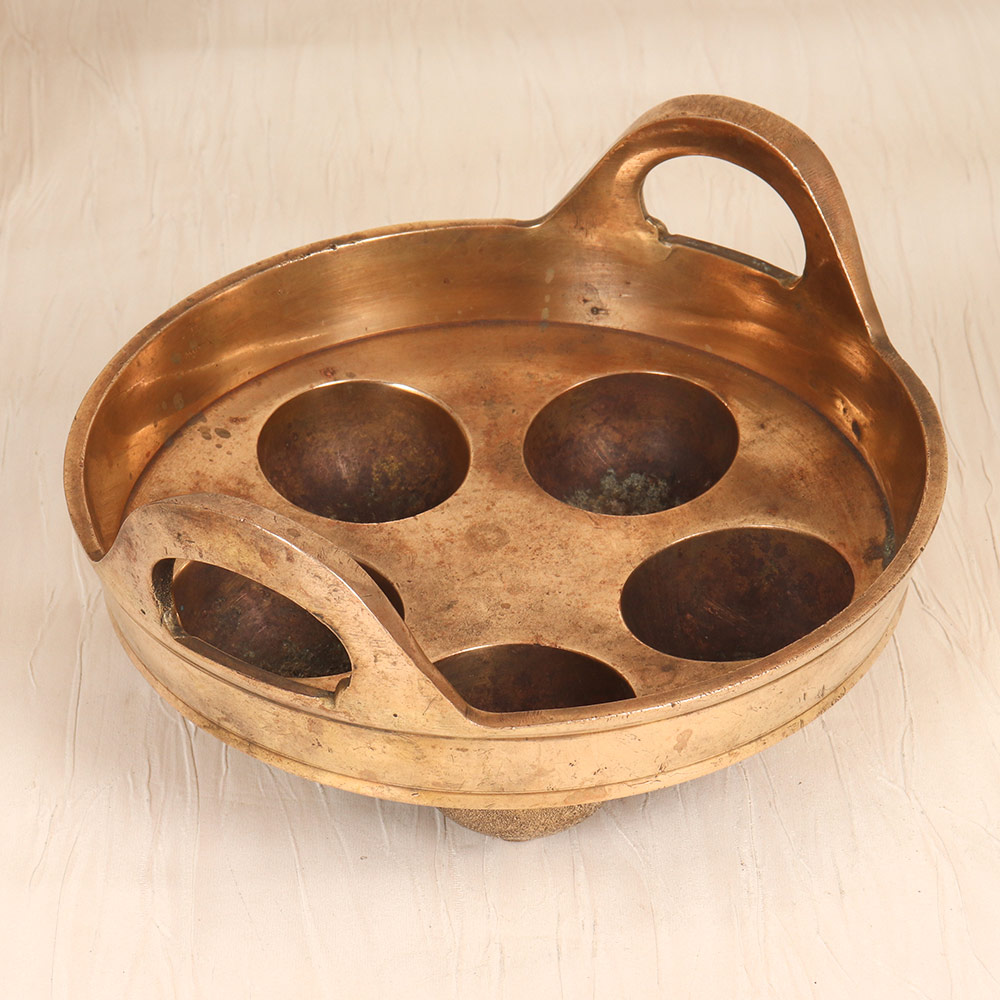 Infuse your space with the captivating vintage charm of this stunning brass Idli cooking utensil, a true testament to the rich culinary heritage of South India. Crafted by skilled artisans using time-honored techniques, this breathtaking piece showcases the unparalleled artistry that defines the region's vibrant culture. Though we recommend using this utensil solely for decorative purposes due to its age, its durable brass construction and intricate, ornate design ensure it will remain a beloved centerpiece for years to come. Whether displayed prominently on your kitchen counter or incorporated as a unique accent piece, this vintage treasure will elevate your décor with its timeless elegance and warm, inviting ambiance. Versatile enough to complement a wide range of design styles, this brass Idli cooking utensil seamlessly blends the old and the new, the traditional and the modern. Elevate your space with the captivating vintage charm of this South Indian artistic masterpiece, and let it transport you to the vibrant flavors and rich history of the region.
