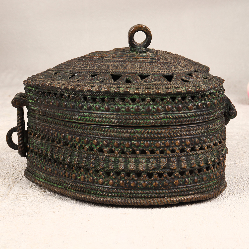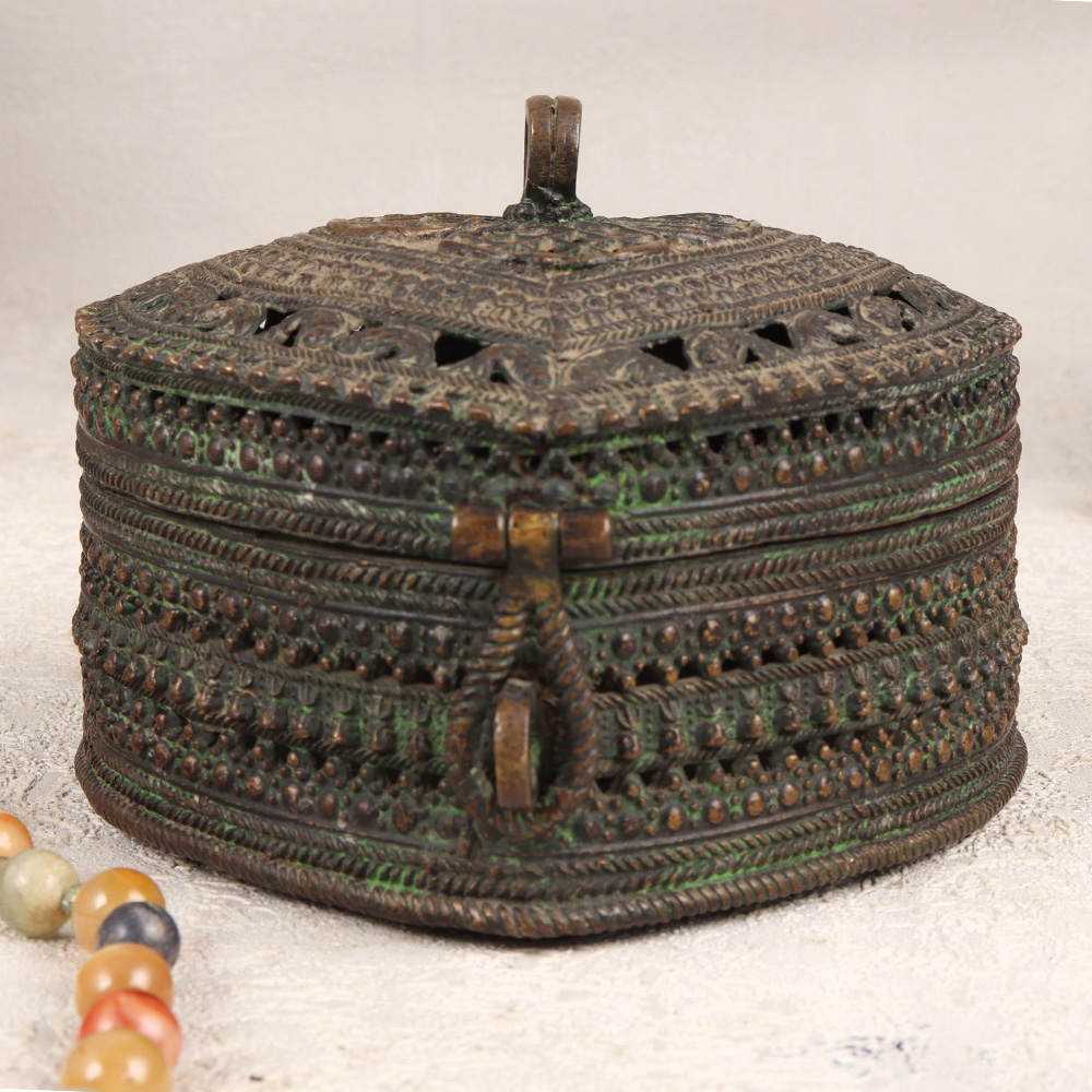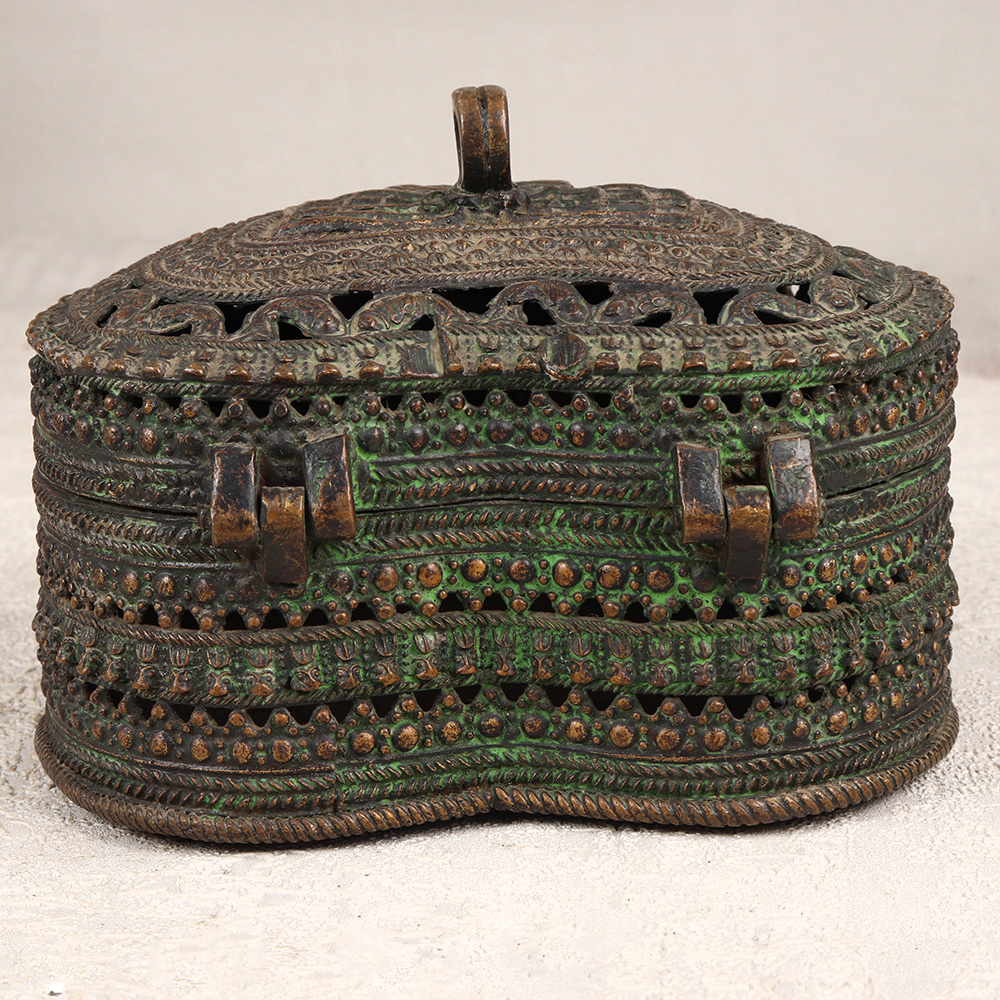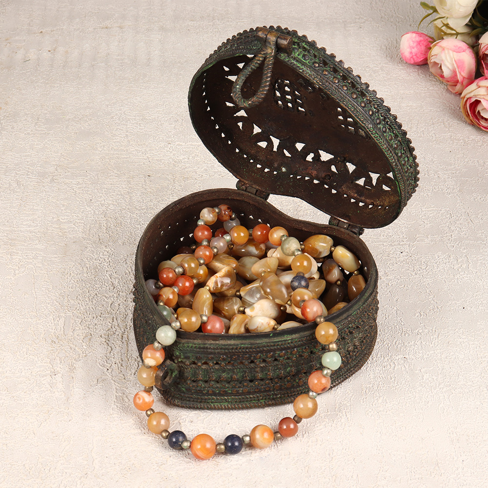 Decorate your interior with our exquisite Vintage Brass Heart-Shaped Jewelry Box that is a testament to the artistry of professional Indian artisans in Odisha. Crafted with precision and passion, this enchanting piece features intricate jali work and captivating engravings on high-quality brass, showcasing the rich heritage of Odisha Art. The heart shape adds a touch of romance, while the antique dark finish lends a timeless allure. This jewelry box comes complete with a secure latch, ensuring the safety of your precious stones and jewelry. Its handmade nature makes each piece unique, embodying the craftsmanship of the artisans who pour their expertise into every detail. Versatile in its application, this jewelry box seamlessly fits into any setting – be it at home, office, restaurant, hotel, or cafe – adding a touch of vintage charm to your space. Ideal for both decoration and functionality, it serves as a perfect addition to any vintage collection. Moreover, it makes for an exceptional gift for your family, friends or relatives on special, festive, or auspicious occasions, expressing your affection through the timeless beauty of this handmade masterpiece.