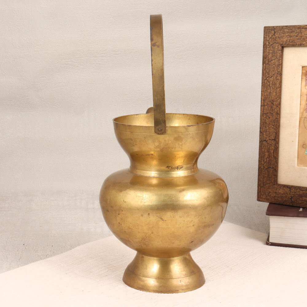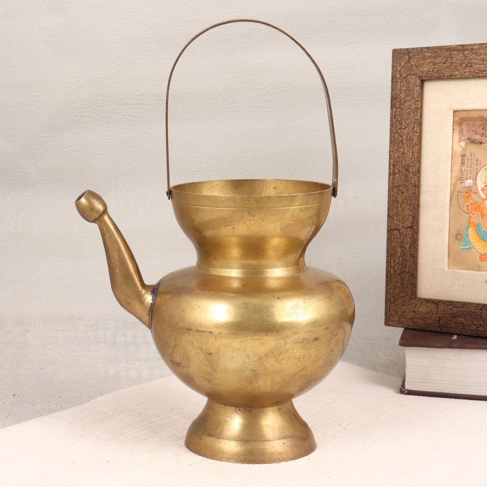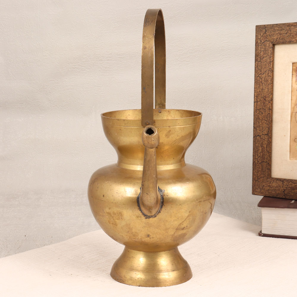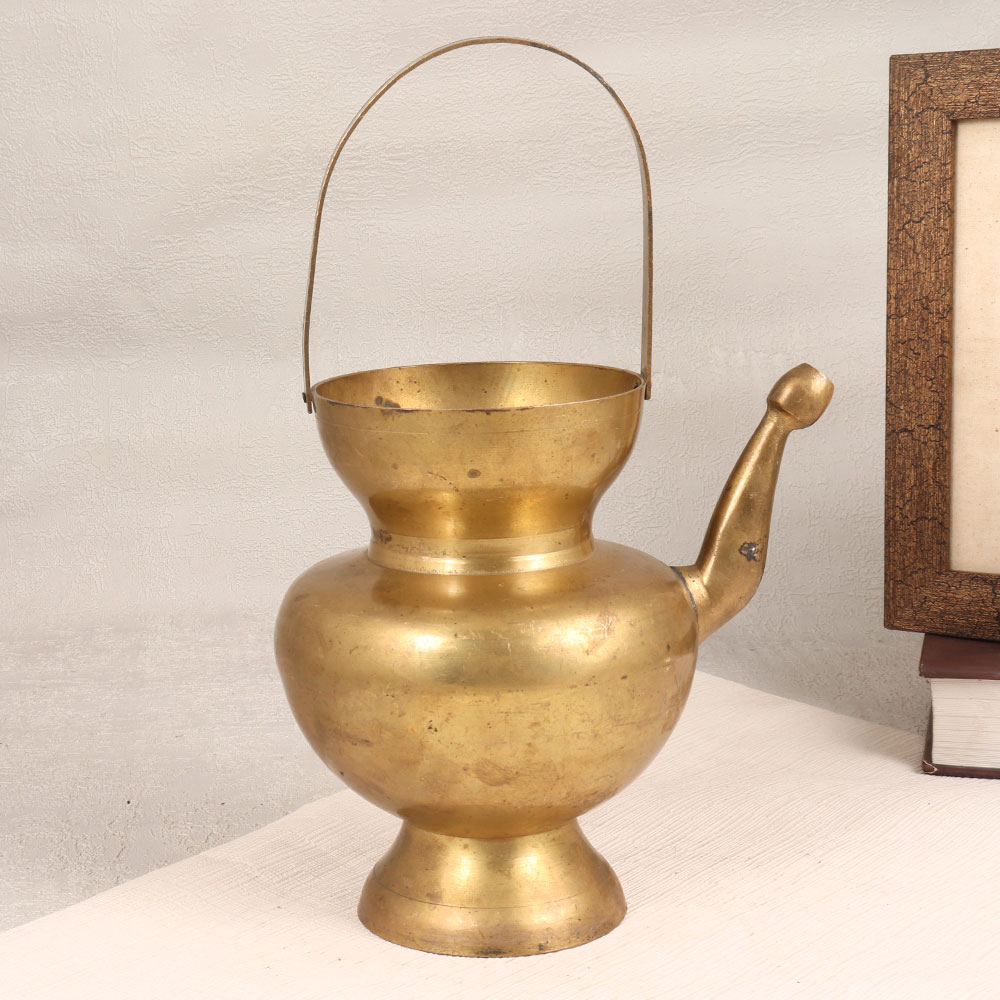 Adorn your living room with the timeless charm of our Vintage Brass Water Pot that is a magnificent Kamandal meticulously crafted by skilled Indian artisans. This exquisite piece boasts a rustic allure with its antique brown finish, highlighting the handcrafted details that make each vessel unique. The inclusion of a sturdy handle and a gracefully curved spout adds practicality and elegance to its design. Made from high-quality brass, this water pot is not only a stunning decorative accent but also a versatile addition to your spaces. Perfect for home, office, restaurant, hotel, or cafe settings, it effortlessly blends tradition with contemporary aesthetics. Embrace its multi-functional nature by using it as a distinctive flower pot, or place it at your temple for a touch of spiritual ambiance. Whether you're building a vintage collection or seeking a thoughtful gift, this Vintage Brass Water Pot is a captivating choice. Surprise your family, friends or relatives on special, festive, or auspicious occasions with a timeless piece that transcends trends and celebrates the artistry of Indian craftsmanship.