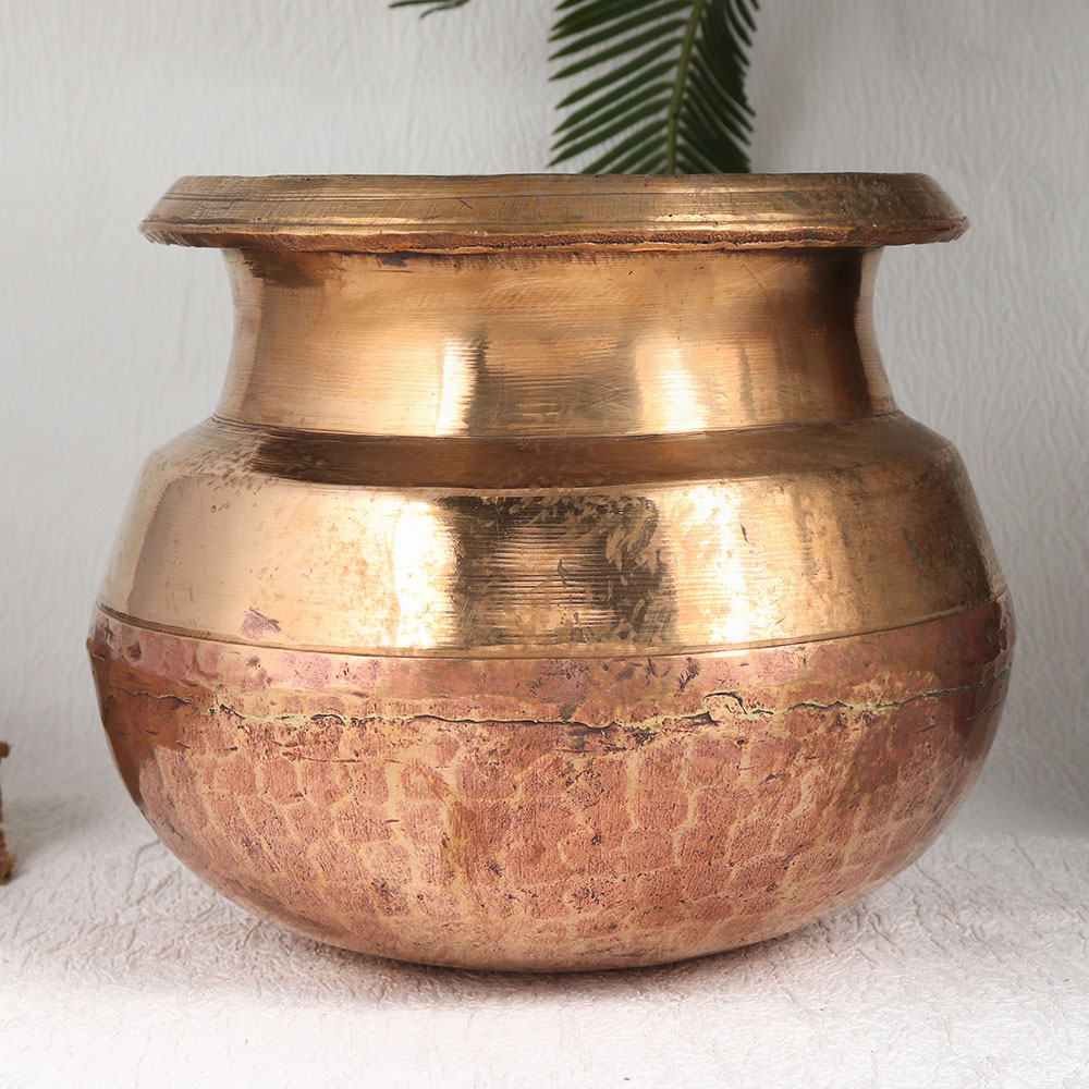 Buy an exquisite Vintage Copper Cooking Pot online which is a true masterpiece crafted with precision by talented Indian artisans. This stunning piece showcases a captivating antique golden finish that adds a touch of old-world charm to any space. Handmade with the utmost care and using high-quality copper, this cooking pot not only exudes timeless elegance but also bears the mark of exceptional craftsmanship. While it may have once graced the kitchens of yesteryears, we recommend using this vintage gem primarily for decorative purposes. Its ornate design makes it a versatile addition to any setting, whether at home, in the office, a restaurant, hotel, cafe, or even a shop. Elevate your interior decor by placing vibrant flowers or lush greenery within, transforming it into a unique and eye-catching flower pot. For collectors and enthusiasts of vintage treasures, this copper pot is a must-have addition to your collection or a stunning exhibit piece. It also makes for a thoughtful and meaningful gift to family, friends or relatives on special occasions, adding a touch of heritage and tradition to their celebrations. Embrace the allure of the past with our Vintage Copper Cooking Pot, a timeless piece that transcends eras and aesthetics.