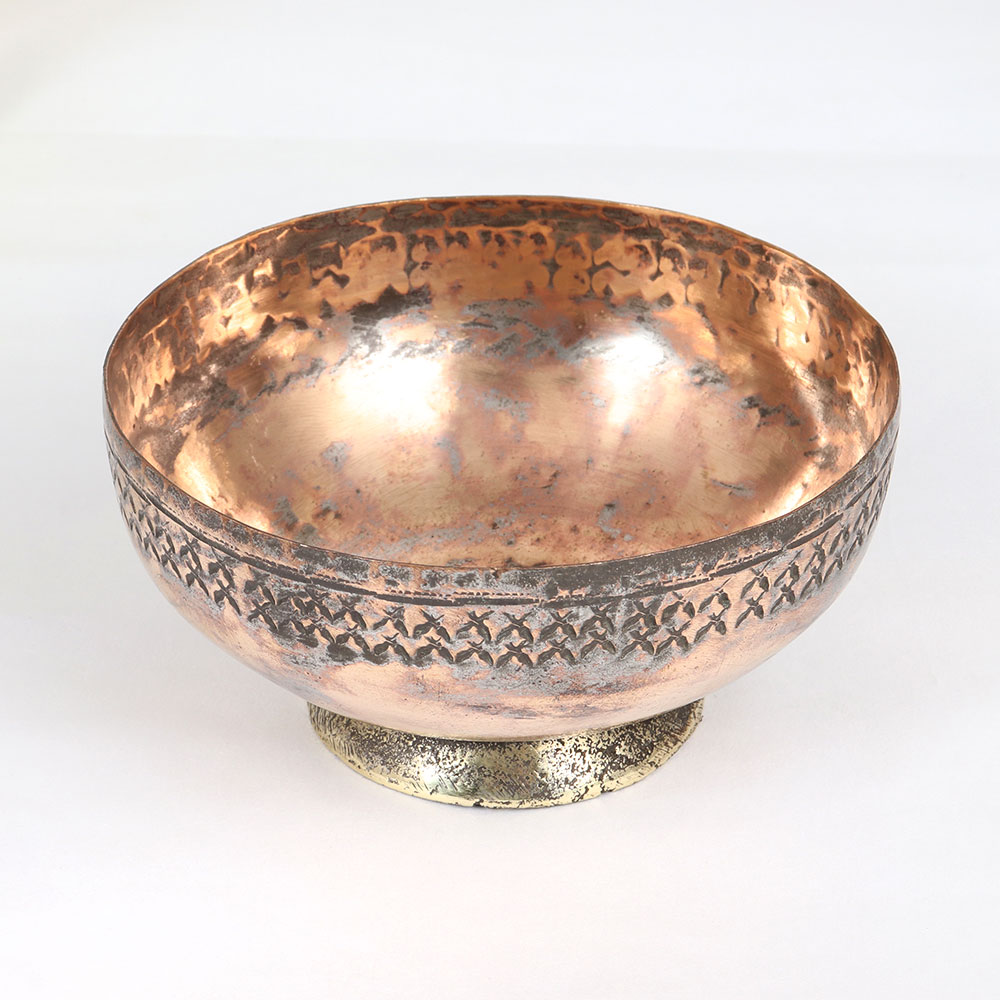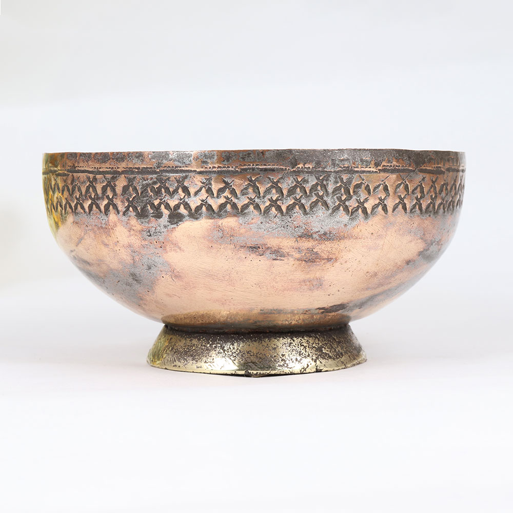 Enhance your surroundings with the timeless allure of our Vintage Copper Bowl that is a true masterpiece crafted by skilled artisans in the tradition of Islamic Art. Meticulously handmade from high-quality copper, this exquisite bowl boasts an antique brown finish that exudes a sense of antiquity and sophistication. The intricate engraving on the bowl showcases the artistry and precision of the craftsmen, capturing the essence of Islamic design with its geometric patterns and delicate details. Its versatile design makes it a perfect addition to various settings, whether adorning your home, office, restaurant, hotel, or cafe. Not just a decorative piece, this copper bowl transforms into a unique indoor flower pot, bringing a touch of nature into your space. Embrace its dual functionality and aesthetic appeal, making it an ideal choice for those seeking both form and function in their decor. For collectors of vintage treasures, this Copper Bowl is a must-have, offering a rare glimpse into the craftsmanship of a bygone era. Additionally, it serves as a thoughtful and meaningful gift for your family, friends or relatives on special, festive, or auspicious occasions, embodying the rich cultural heritage and artistry that transcends time. Embrace the beauty of the past with this Vintage Copper Bowl, a symbol of enduring craftsmanship and refined elegance.