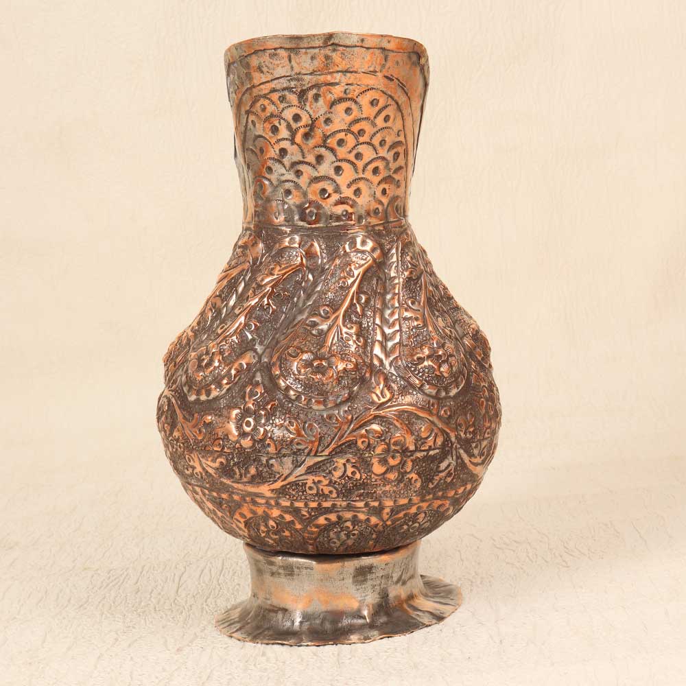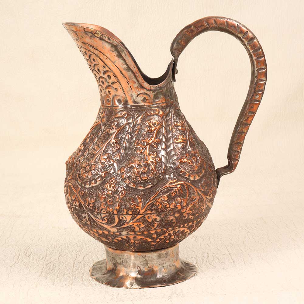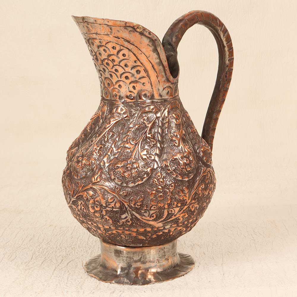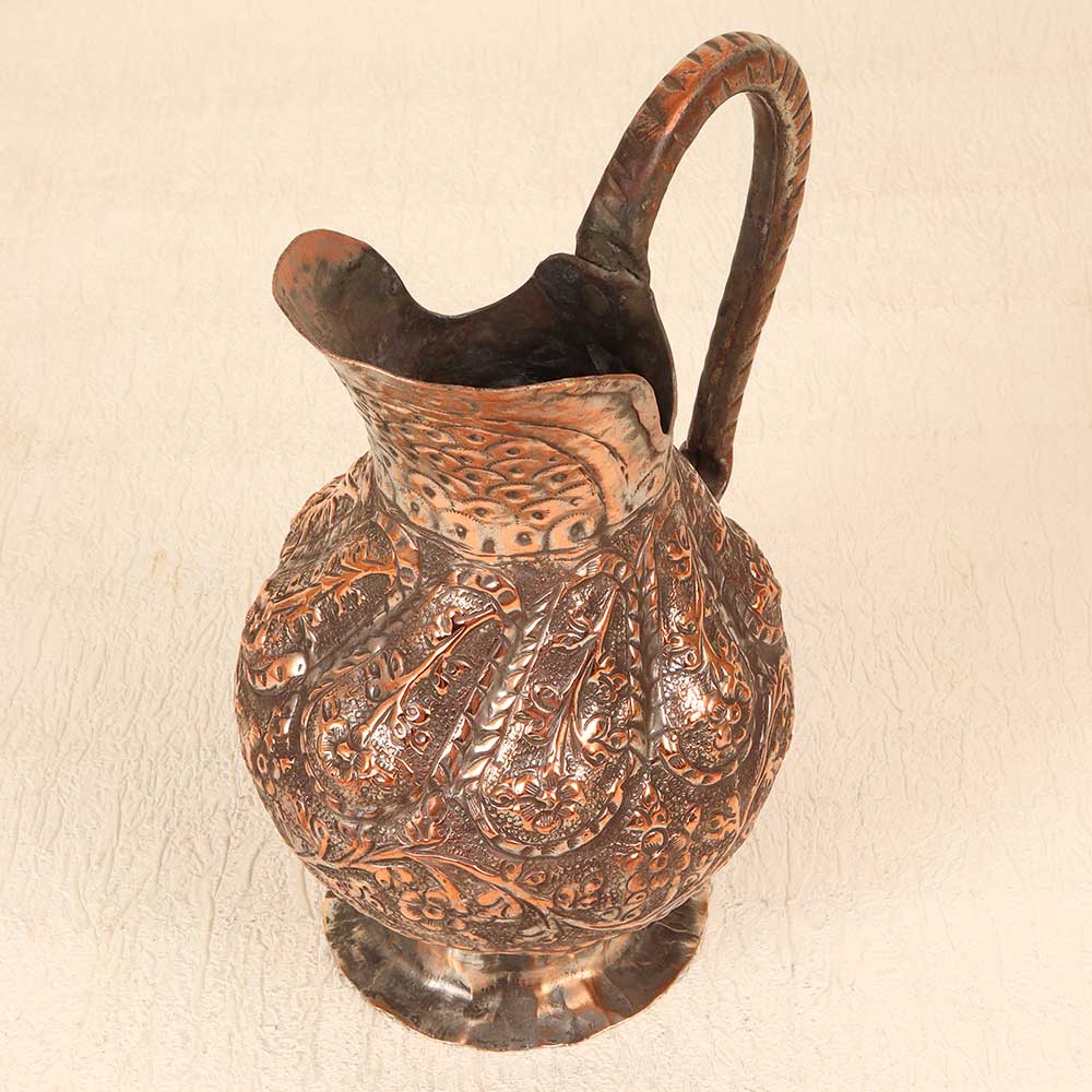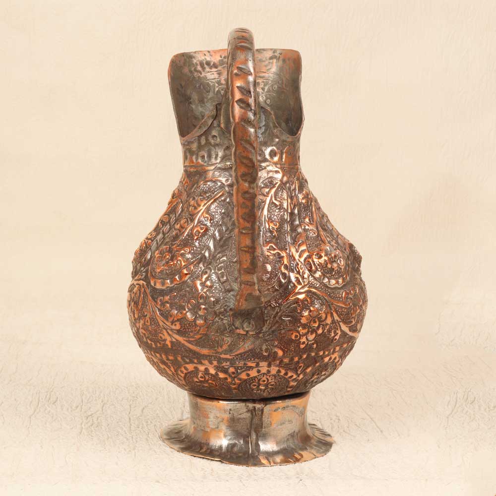 Step back in time with this antique copper jug featuring the mesmerizing patterns of Islamic art. This stunning jug was handcrafted many years ago using time-honored metalworking techniques that imbue it with a sense of history. Proudly display this copper jug as an heirloom piece that sparks inspiration. The hypnotic patterns and craftsmanship reflect the Golden Age of Islam in a way that feels simultaneously ancient and modern. Let this jug become a treasured conversation piece during intimate gatherings with loved ones. Its vintage charm and exotic allure make it a decorative accent that transcends time.