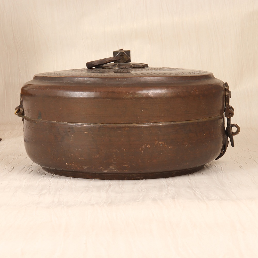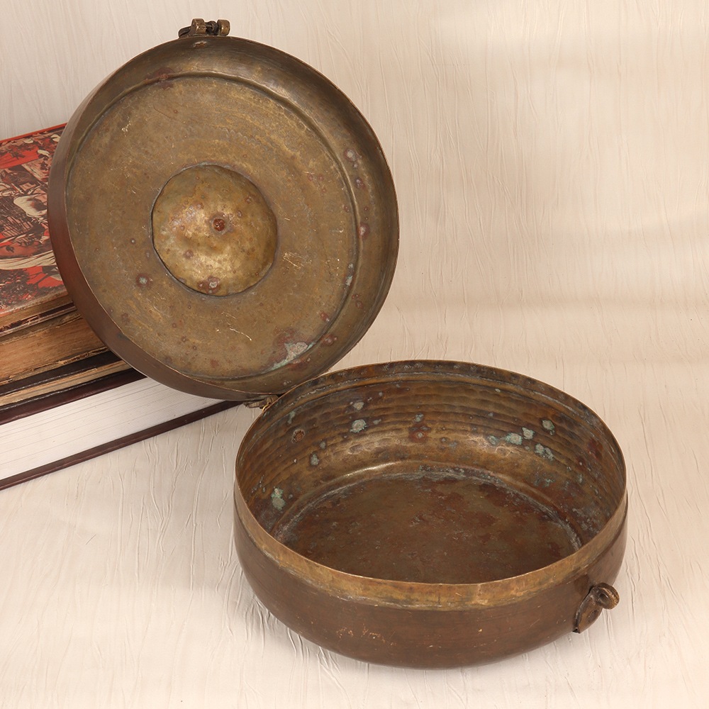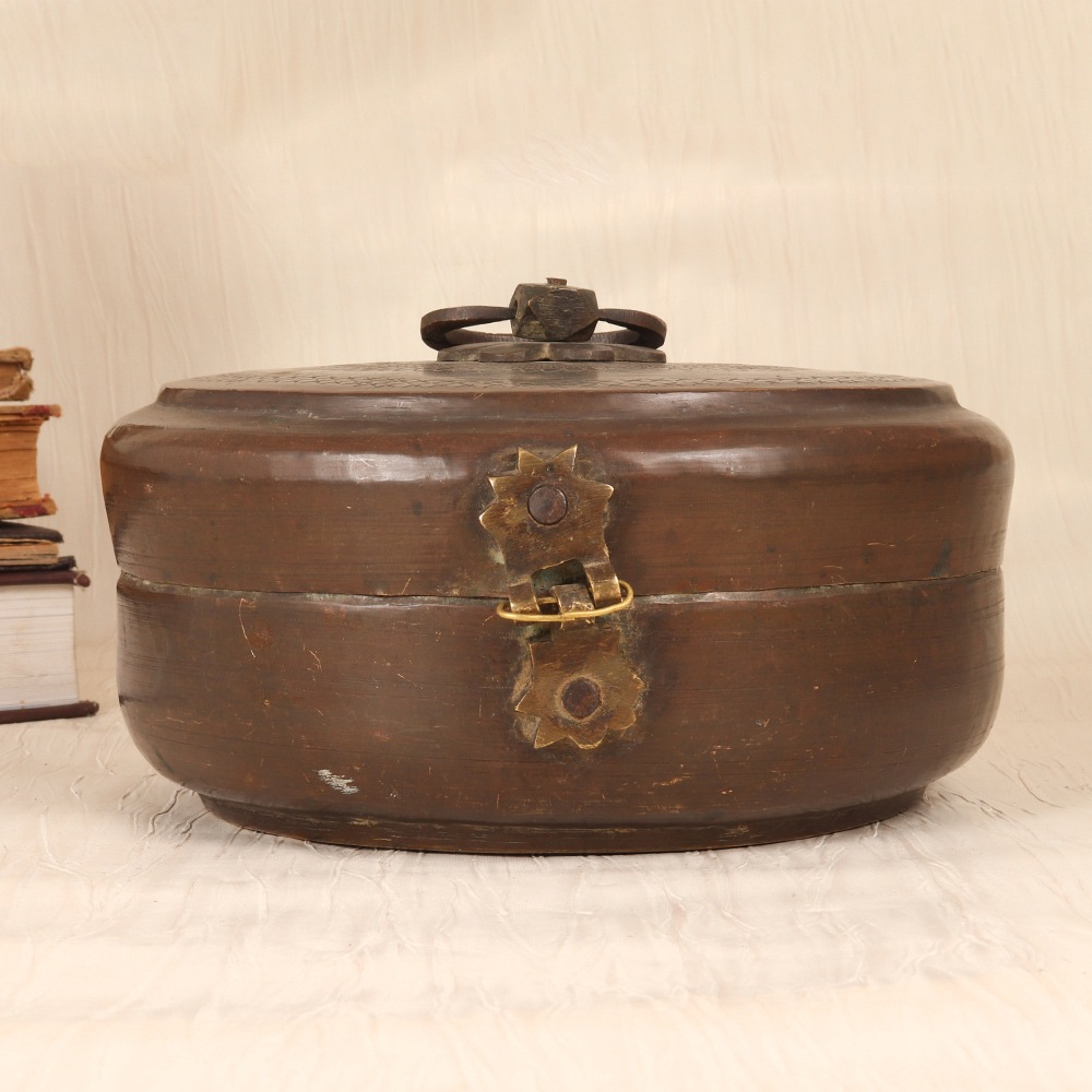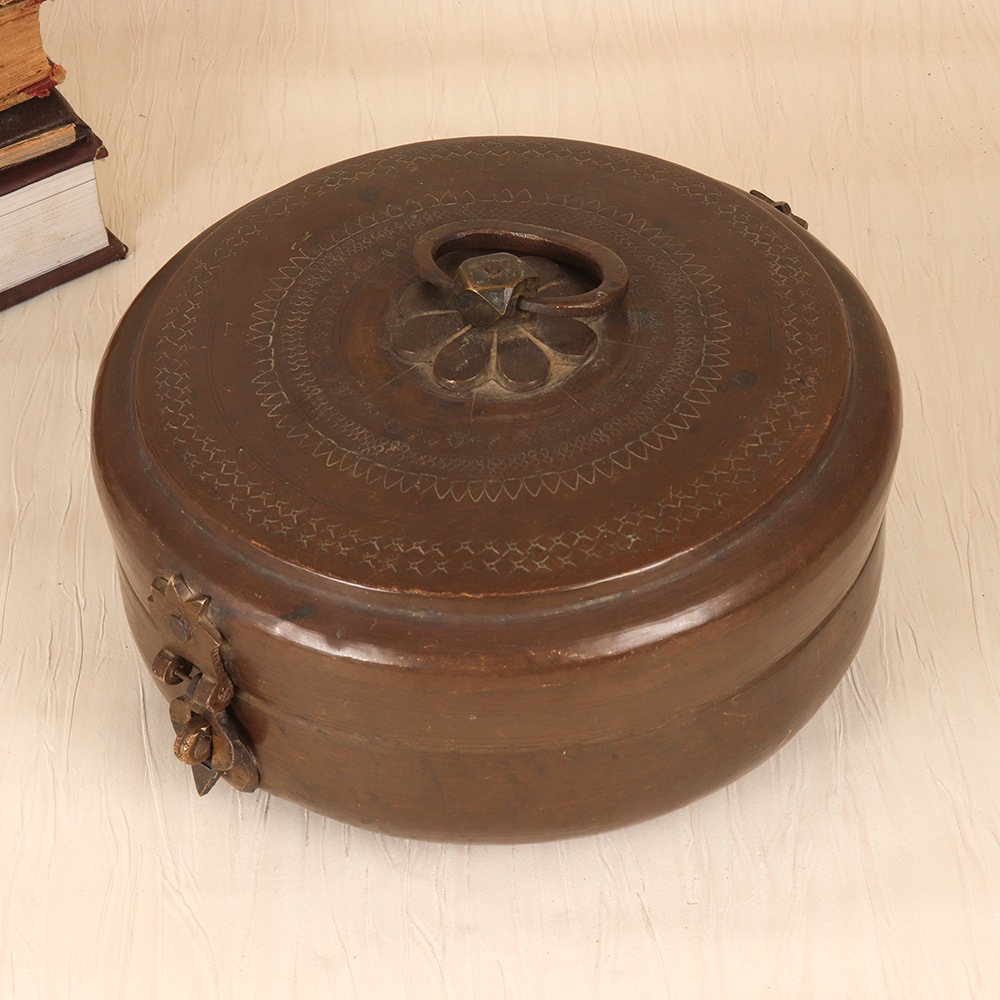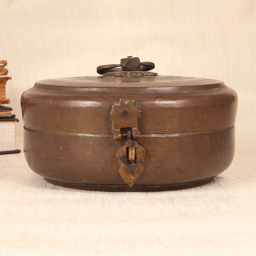 Unlock the captivating allure of Rajasthani culture with this stunning vintage brass Chapati box. Meticulously crafted by skilled artisans, this piece showcases the region's renowned artistic traditions through its intricate engraving. More than just a functional storage container, it doubles as a captivating decorative accent that will elevate the ambiance of any space. Crafted from durable brass, this Chapati box is built to withstand the test of time, maintaining its lustrous beauty for years to come. The vintage finish lends an air of antique charm, seamlessly blending modern and traditional aesthetics. Whether displayed on a shelf, table, or sideboard, this unique item is sure to draw admiring glances and spark conversations about its origins. Invest in a piece that will infuse your living space with the vibrant cultural essence of Rajasthan and serve as a timeless reminder of the region's captivating artistry.
