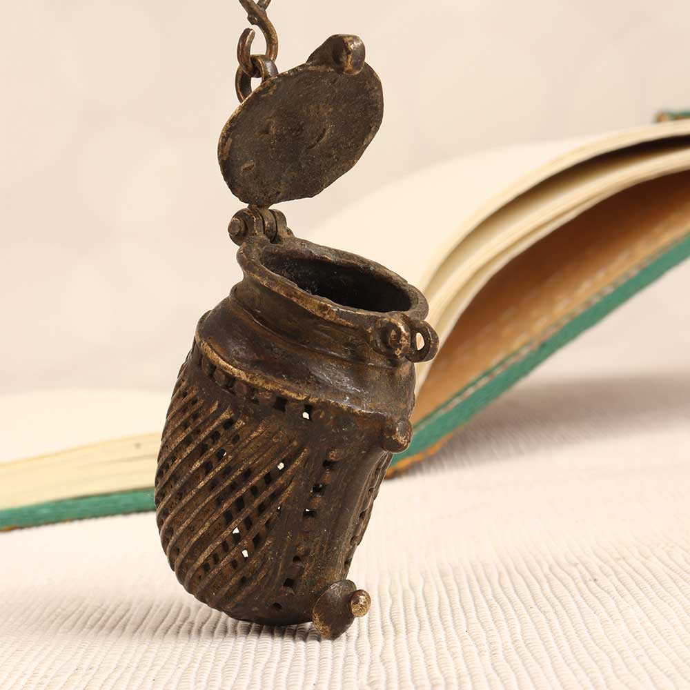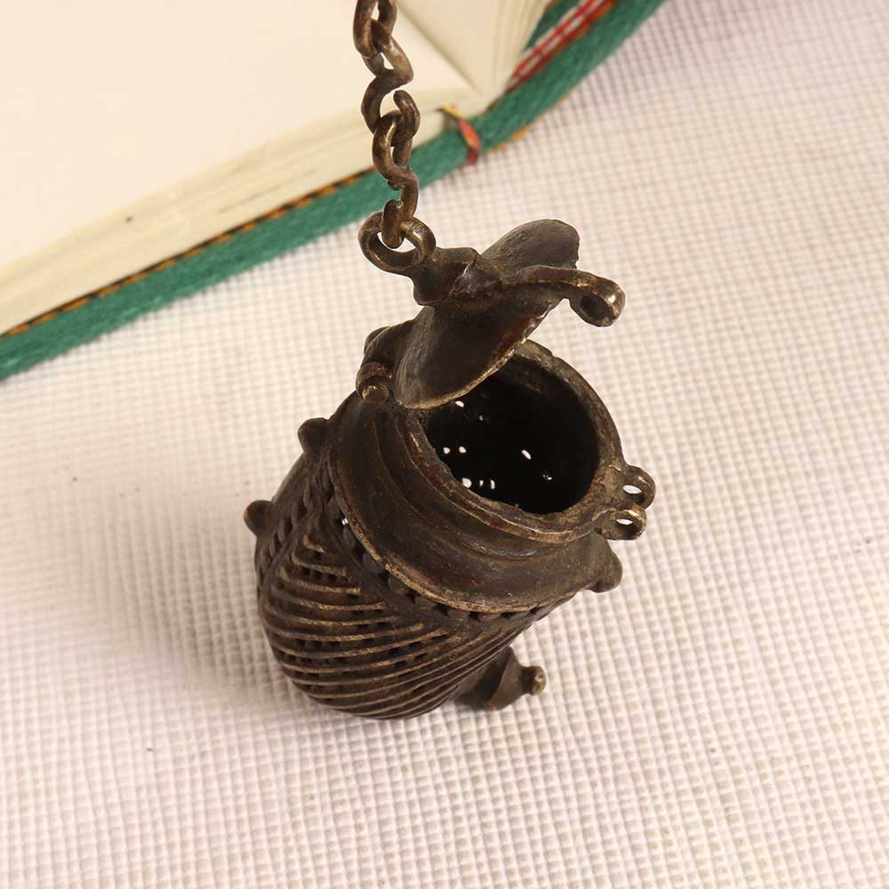 Make a bold statement with this vintage-inspired brass tribal mango shape box. Handcrafted using the ancient jali technique, intricate lacelike patterns dance across the mango-shaped vessel, allowing light to filter through the tiny perforations. Jali work has adorned Indian architecture and design for centuries. This ancient art form creates visual interest through delicate shapes and negative space rather than solid surfaces. Tiny perforations form ornate patterns across metals, stone and wood. Bring a touch of exotic flair into your home with this handcrafted box. A real statement piece, display it in your living room, bedroom or entryway as an eye-catching accent. This global-inspired box also makes a memorable gift for a world traveler or design lover.