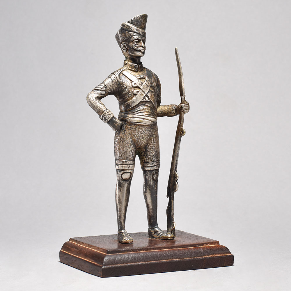 - Depicts a proud soldier holding his rifle at the ready