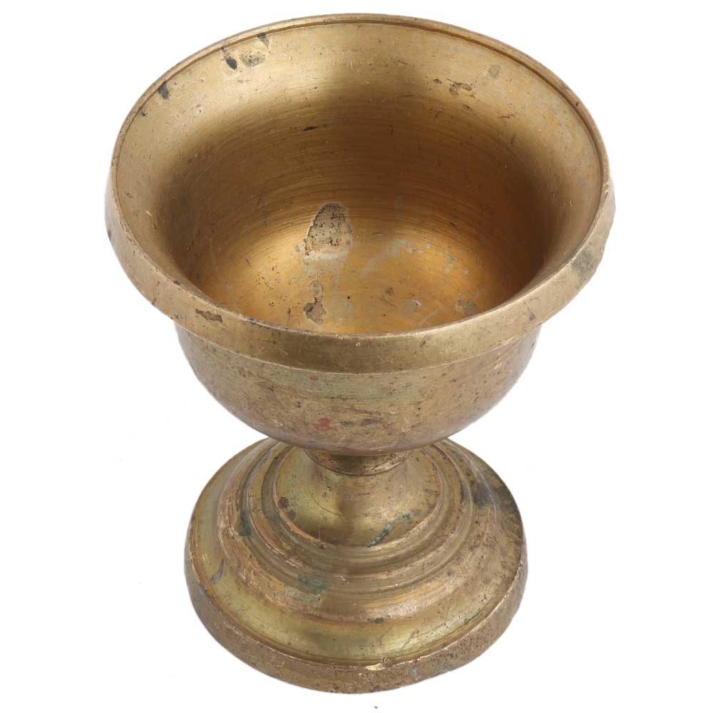 This designer brass mug has a round base mounted on a tall stand. You can place it in the living room or dining table to complement traditional decorations.