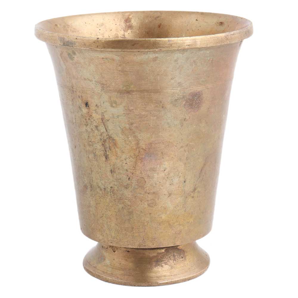This handmade glass tumbler in solid brass metal with a round base can be used as a planter or flower pot. You can give it to your relatives during christmas, diwali or a wedding.