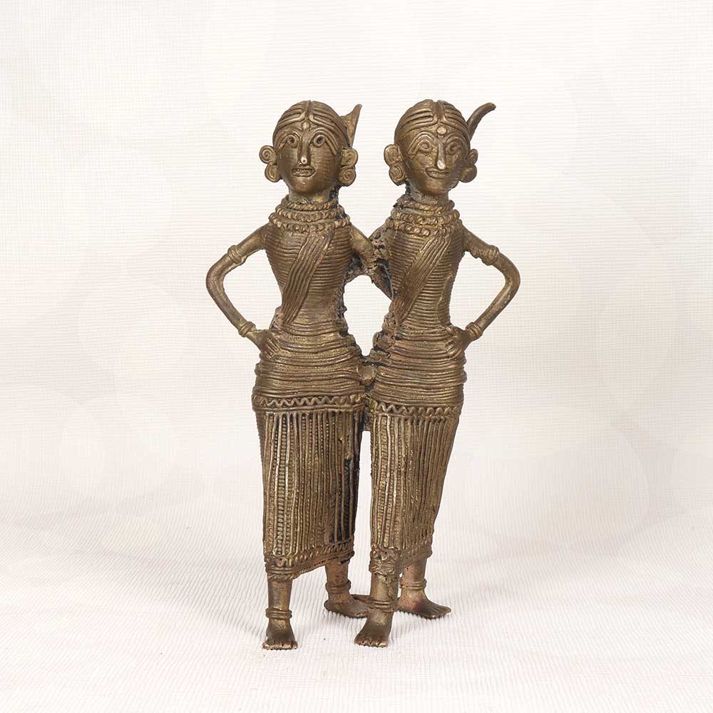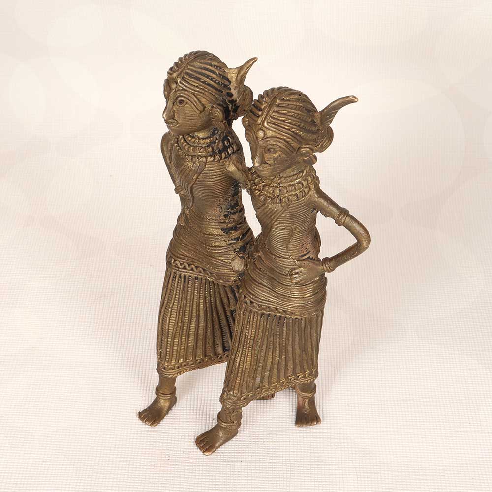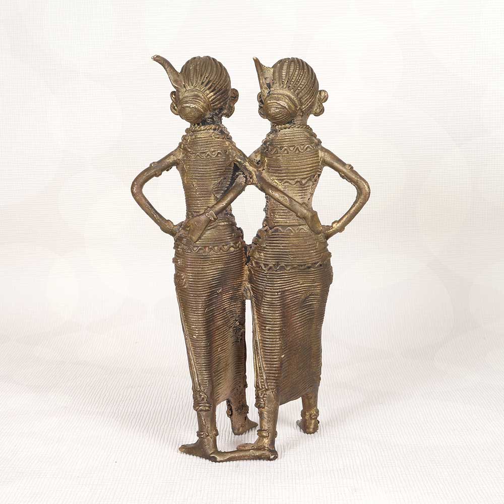 This exquisite vintage brass two lady statue is a must-have for lovers of cultural art and decor. Showcasing the incredible metalworking of Bengali artists, it features two Indian women standing back to back, their bodies and clothing intricately sculpted. This is decor that tells a story. The sculptural elegance and expressive details provide a window into rich cultural tradition. Displaying this statue in your home or garden adds an exotic, artistic touch that sparks conversation. It makes a striking statement on a console table, bookshelf, patio or garden pedestal. For an accent piece that transports you to another place and time, this vintage brass two lady statue has immense visual appeal. Let its old-world charm and artistry elevate your home today.