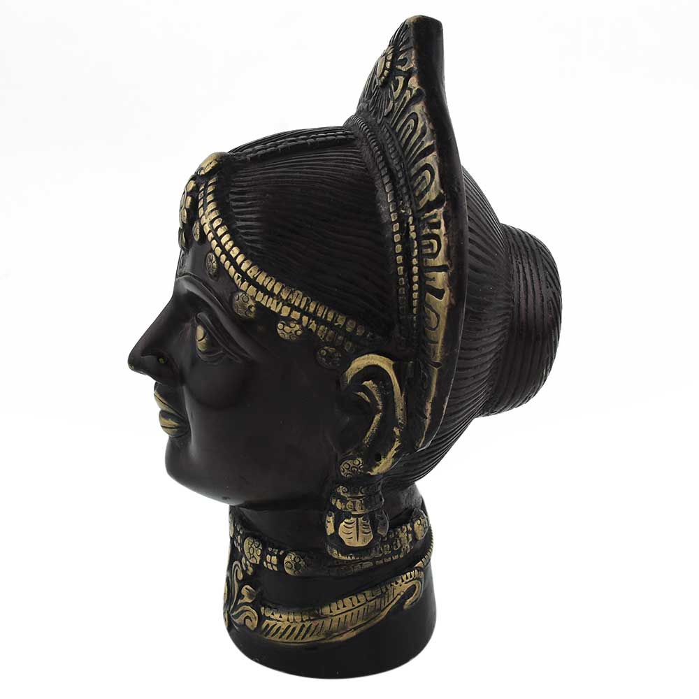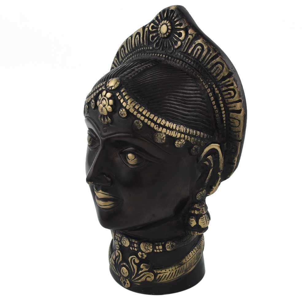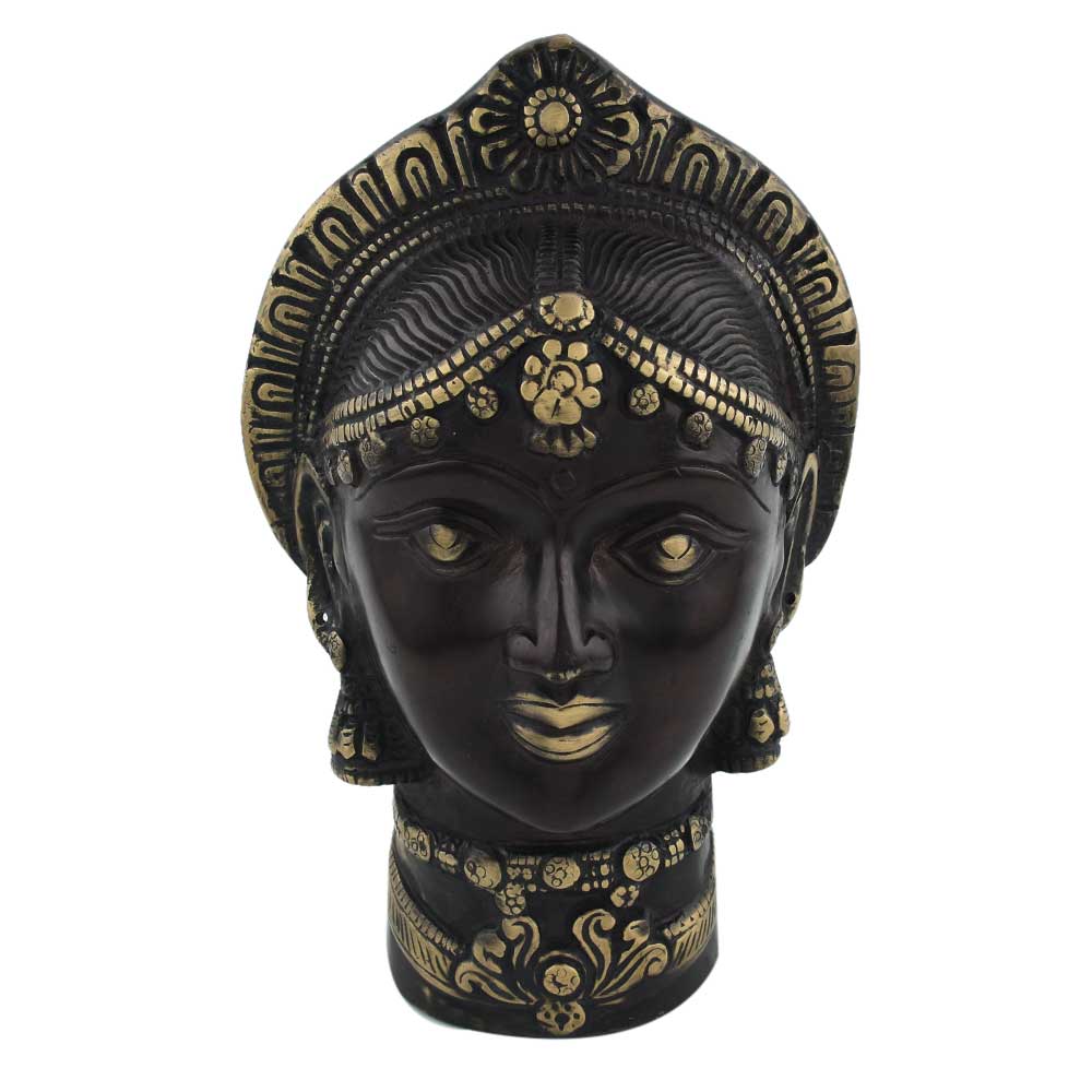 This handcrafted goddess Gangaur Gauri face in solid brass can be used indoors or out, and can be placed on the wall shelf, near the entry or in the puja area. It has a black varnish making it a vintage-style décor item.