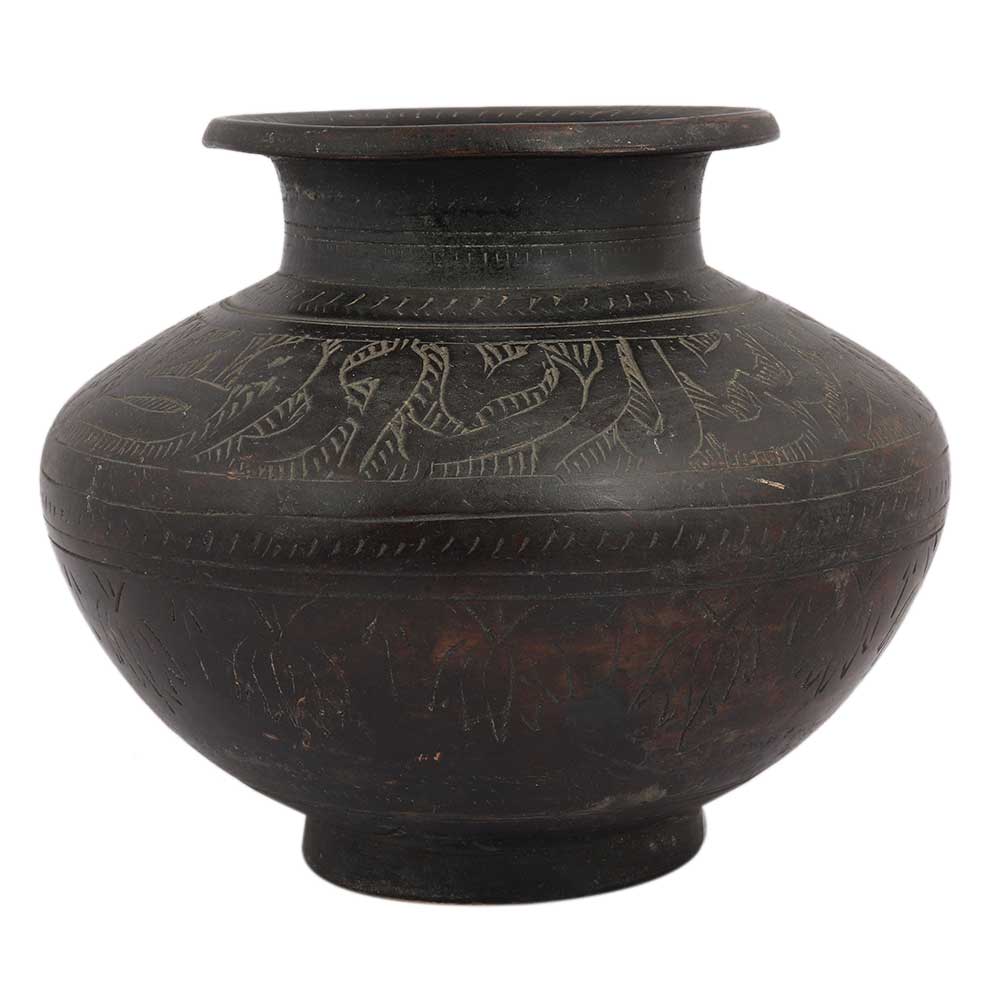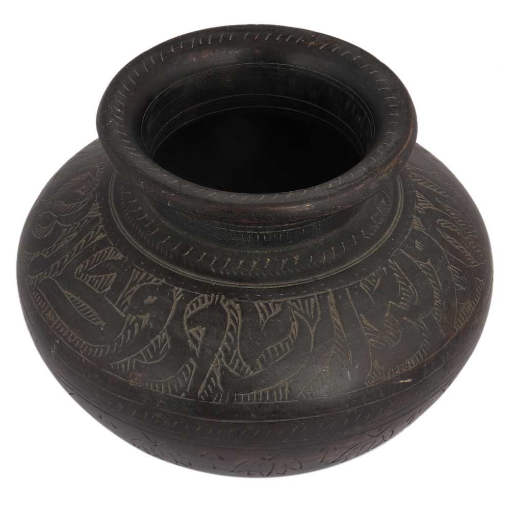 The ancient Indian pot is a valuable collectible with religious significance. It's a small vintage pot made of brass that might be a wonderful addition to your decor. The craftsmanship is difficult to duplicate because it is handcrafted by artists. It has a lot of age on it.