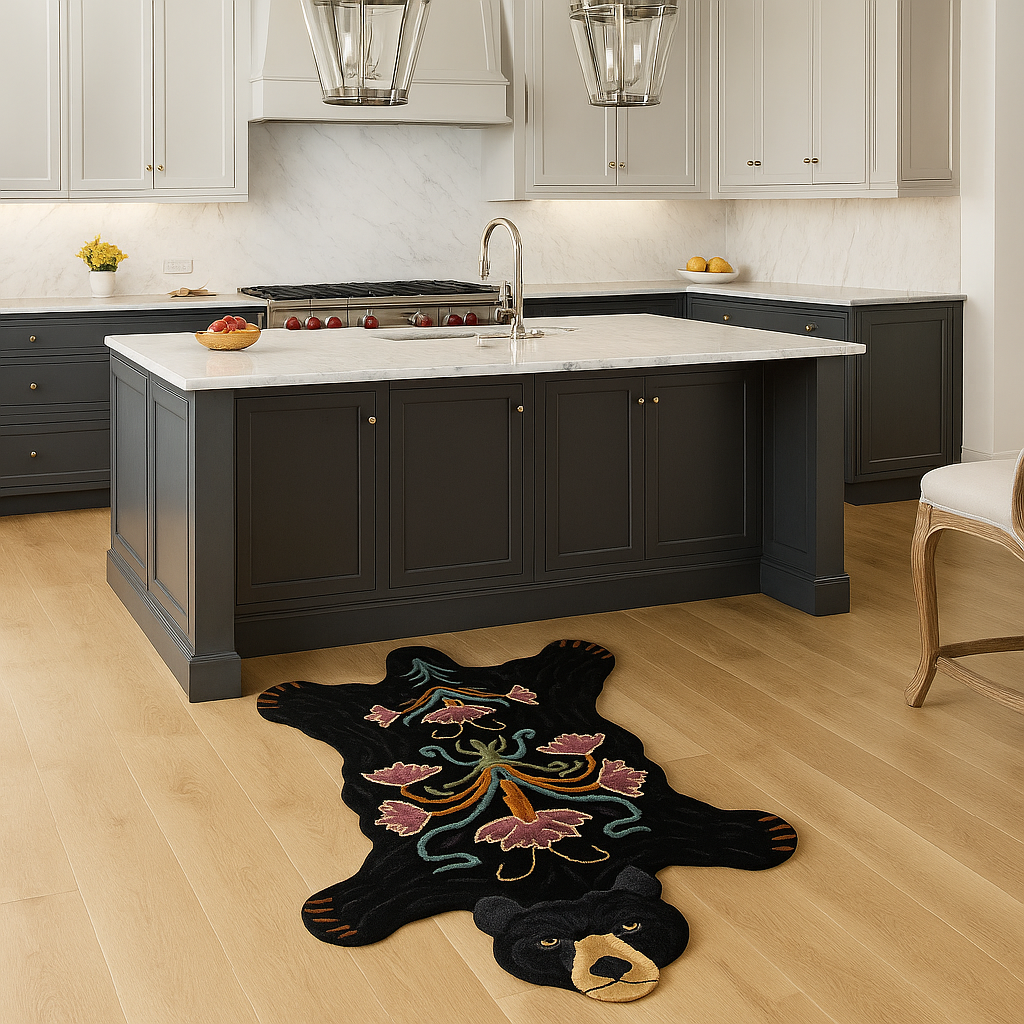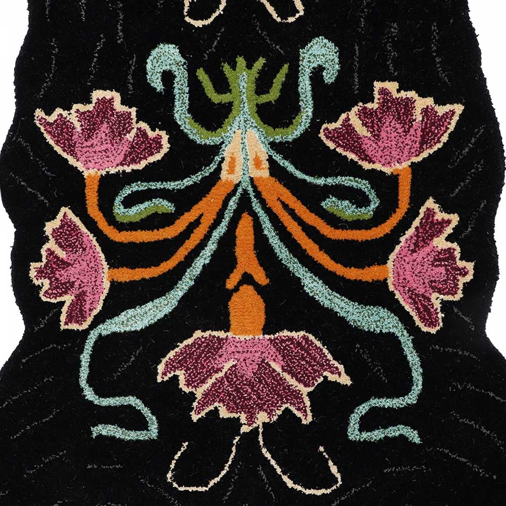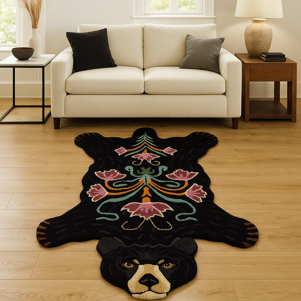 This flowering black Bear rug is hand tufted from dyed genuine sheep wool. Designed and developed in a small workshop, skilled artisans ensure the highest quality. Each detail, stripe, and dot is added with extreme care. Add a charming animal rug to your living space! Rather than hunting animals, we depicted them in carpets by tradition. These animal skin rugs add a touch of whimsy and charm to any room. Perfect for friends and family.