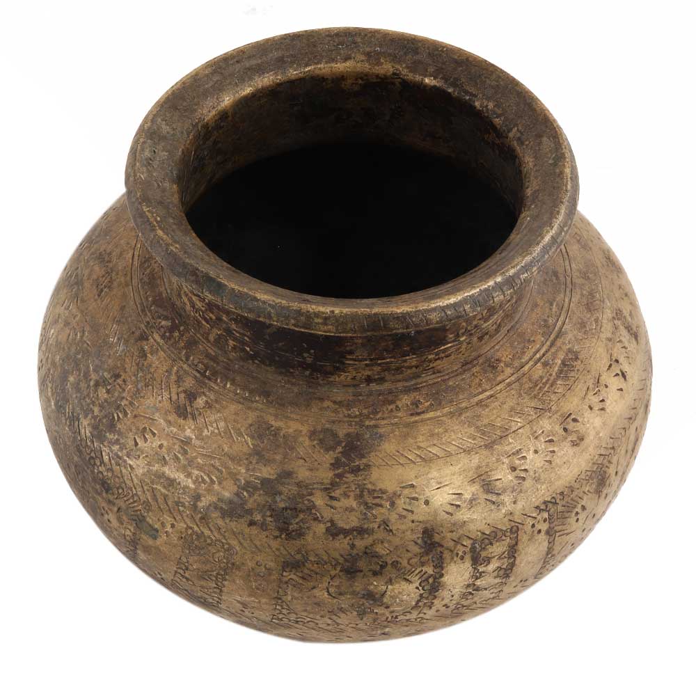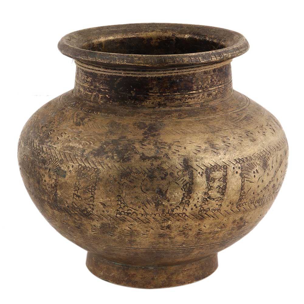 This blackened brass water pot is used as a planter and kept at your entrance door, foyer area or any suitable corner of your living room.