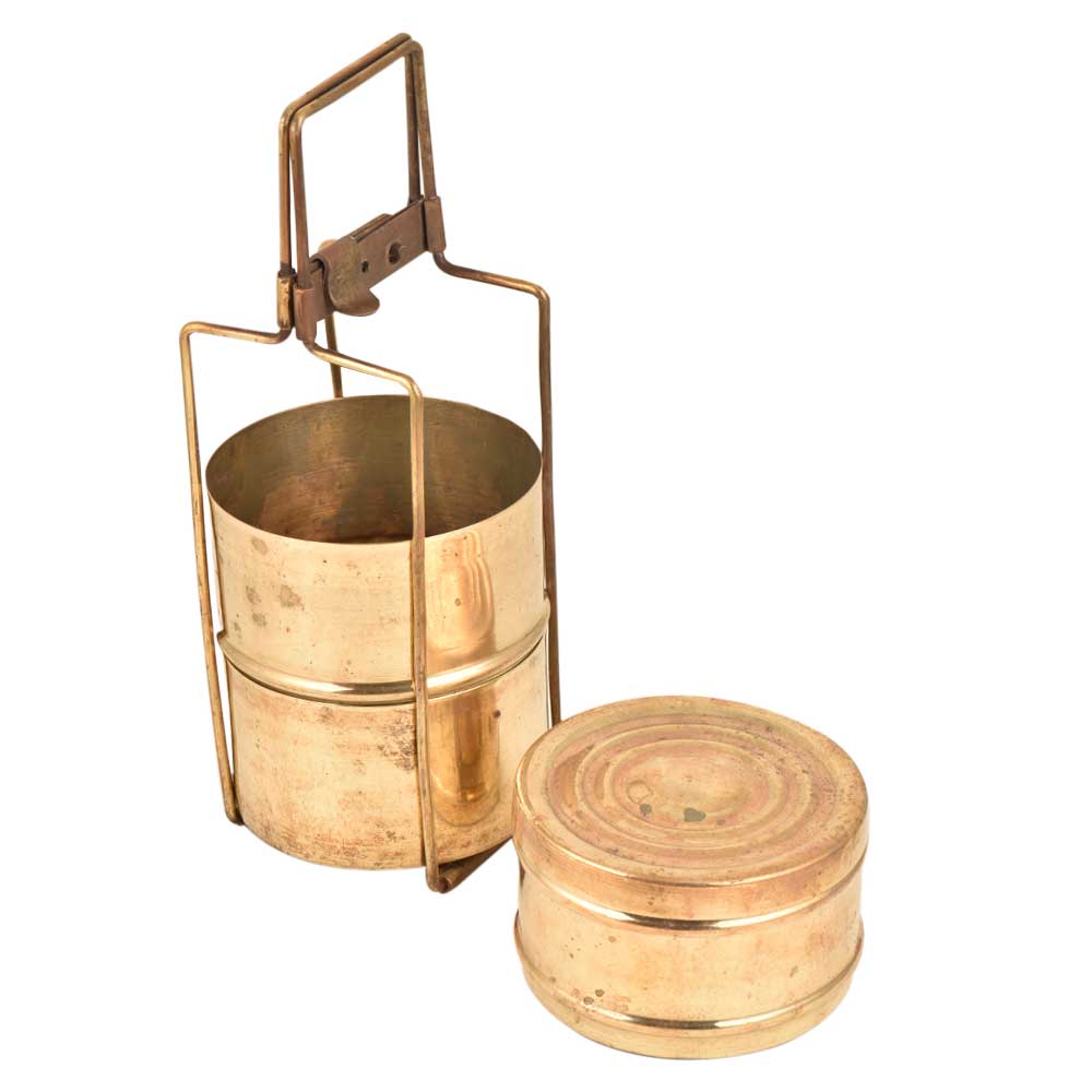 This is an old brass lunch box with three containers. The brass lunch boxes were very popular and are now used as table ornaments, jewelry storage or presentation of food .The boxes were are engraved with the names of the owner so that it could not be misplaced.