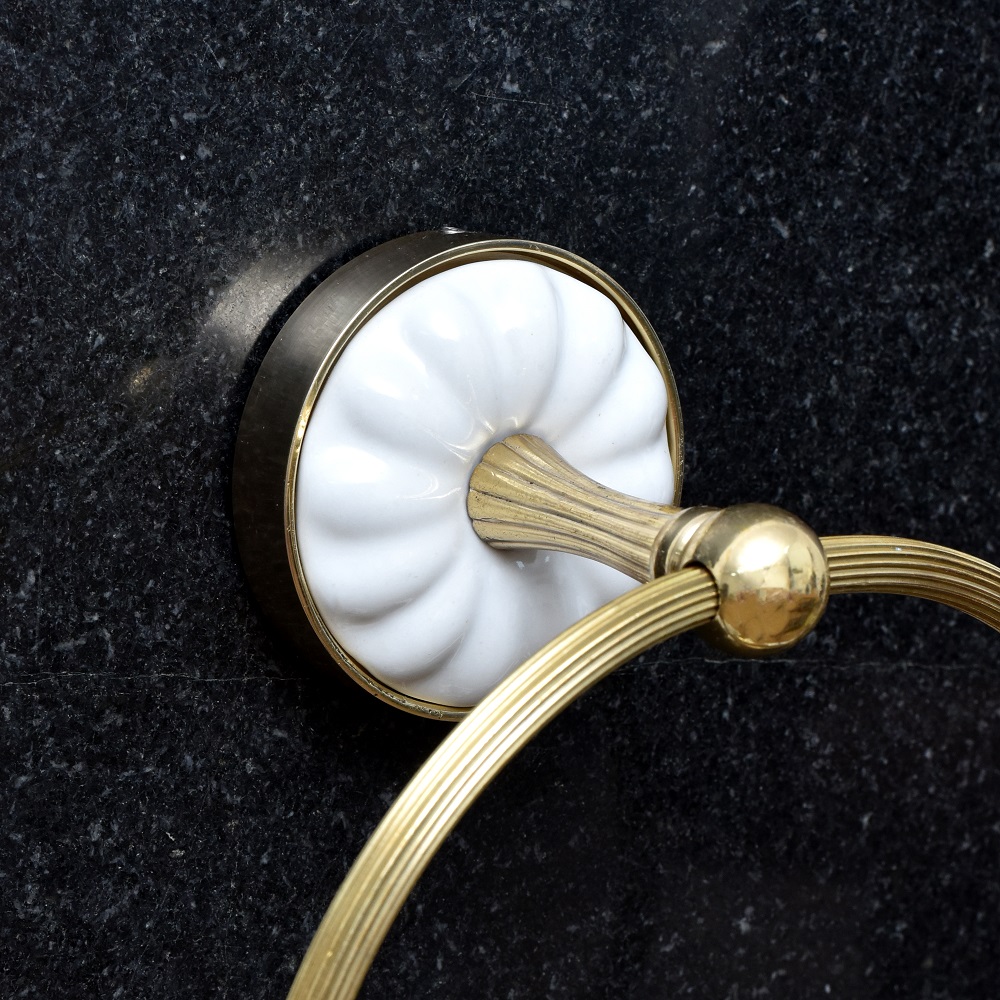 The high-quality brass construction ensures that this towel ring hanger will maintain its beauty and functionality over time. The ceramic element adds a touch of elegance while being easy to clean and maintain. Simply wipe it down with a soft cloth to keep it shining.