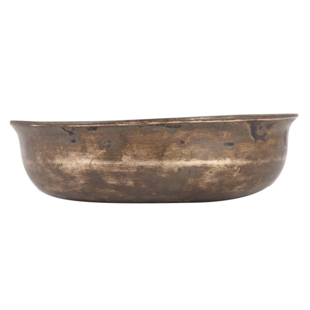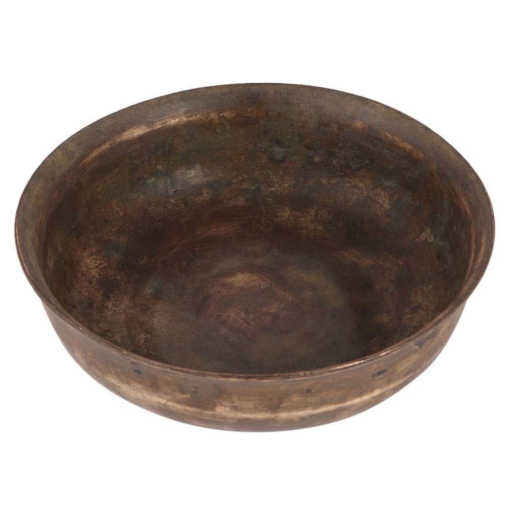 Brutalist iron centerpiece bowl with edges accented with braised brass. To prevent oxidation, the bowl is sealed with a matte lacquer. Handcrafted and features textures that are intended to add character to the metal.