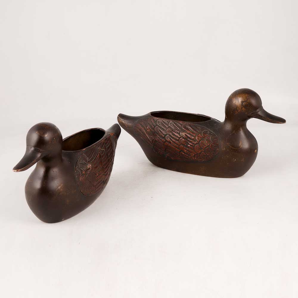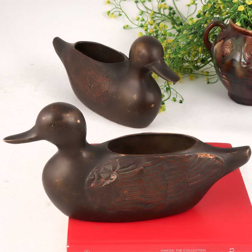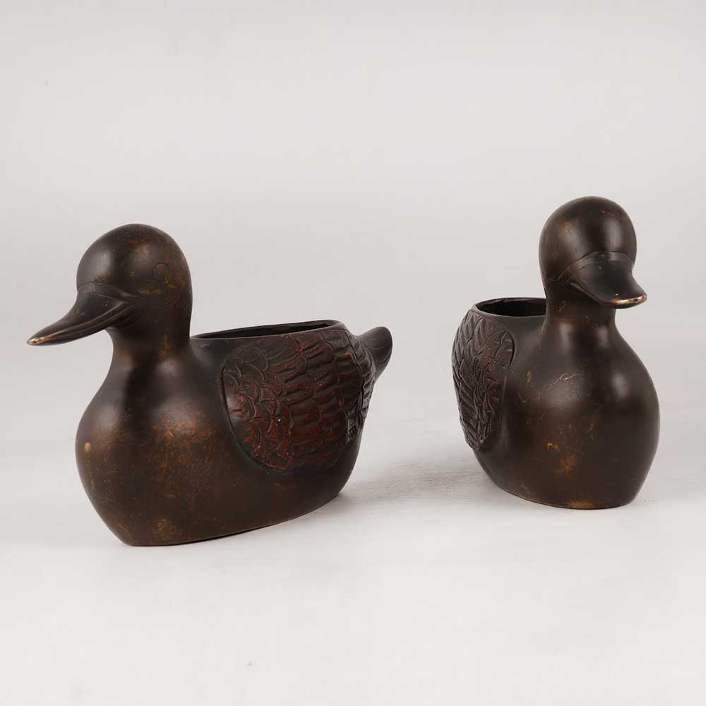 This Brass and Copper Duck Pair in Antique Brown Finish is a true work of art handcrafted by highly talented artisans. With a timeless appeal, these charming ducks will add a touch of sophistication to any space. Ideal for home, office, restaurant, hotel, or cafe decor, these ducks serve a dual purpose as both a flower pot and a pen stand, making them versatile and functional. Their elegant design and intricate detailing make them stand out as a perfect addition to any vintage collection, enhancing the overall aesthetics. Whether displayed at an exhibition or showcased as part of your interior decor, these ducks are sure to capture attention and admiration from onlookers. The warm Antique Brown Finish adds a vintage charm, accentuating their artistic allure. These Brass and Copper Ducks make for thoughtful gifts on special or festive occasions, symbolizing love, grace, and beauty. Surprise your loved ones with a gift that reflects both artistry and affection, making a lasting impression for years to come. Embrace the allure of artisanal craftsmanship and bring home this stunning duck pair to elevate your decor and style.