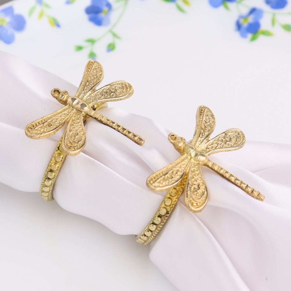 Add an elegant touch to your dining experience with our exquisite set of 4 Brass Napkin Rings, adorned with charming Dragonfly motifs. Crafted by talented Indian craftsmen, each napkin ring is a testament to the rich heritage of craftsmanship and attention to detail. The antique golden finish adds a touch of sophistication, making these napkin rings a perfect complement to any table setting. Handmade from high-quality brass, these napkin rings not only serve as a practical table accessory but also double up as beautiful pieces of art. The Dragonfly design symbolizes wisdom, strength, and good luck, making them a meaningful addition to your dining decor. These versatile napkin rings are perfect for both casual family dinners and formal gatherings. They hold napkins in place, preventing them from slipping off the table and adding an element of finesse to the overall presentation. Beyond their functional use, these brass napkin rings make for a thoughtful and cherished gift for your loved ones. Whether it's a special occasion or a festive celebration, these exquisite napkin rings are a unique and heartfelt present that will be cherished for years to come. Surprise your friends and family with this timeless and culturally-rich gift, which seamlessly combines beauty, tradition, and utility.