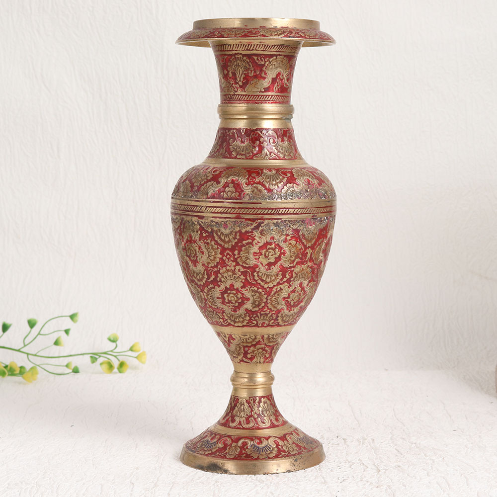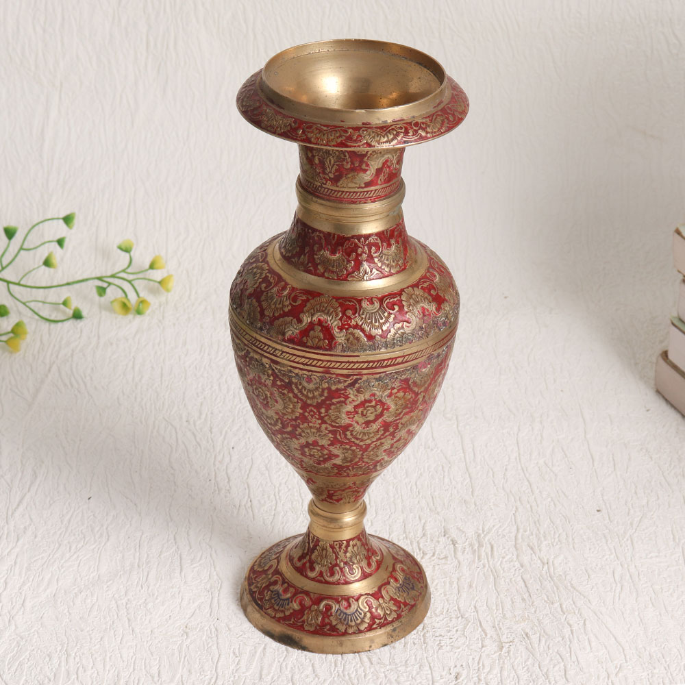 Buy a Vintage Brass Flower Pot online from our website and get a hassle free delivery at your doorstep. Crafted by highly skilled and experienced Indian artisans hailing from the historic city of Hyderabad, this exquisite piece showcases the rich heritage of craftsmanship. Made from high-quality brass, it exudes durability and elegance. The flower pot boasts a captivating design, meticulously engraved and accented with a striking red enamel colour, set against an antique brown finish. Its intricate patterns and vibrant hues make it a captivating addition to any space, whether it's your home, office, restaurant, hotel, cafe, or shop. This versatile piece serves as more than just a flower pot, it's a work of art that can be proudly displayed in your vintage collection or showcased at exhibitions. It's also a thoughtful gift for your family, friends or relatives on special, festive, or auspicious occasions. Embrace the fusion of tradition and aesthetics with this Vintage Brass Flower Pot, and let it add a touch of grace to your surroundings.